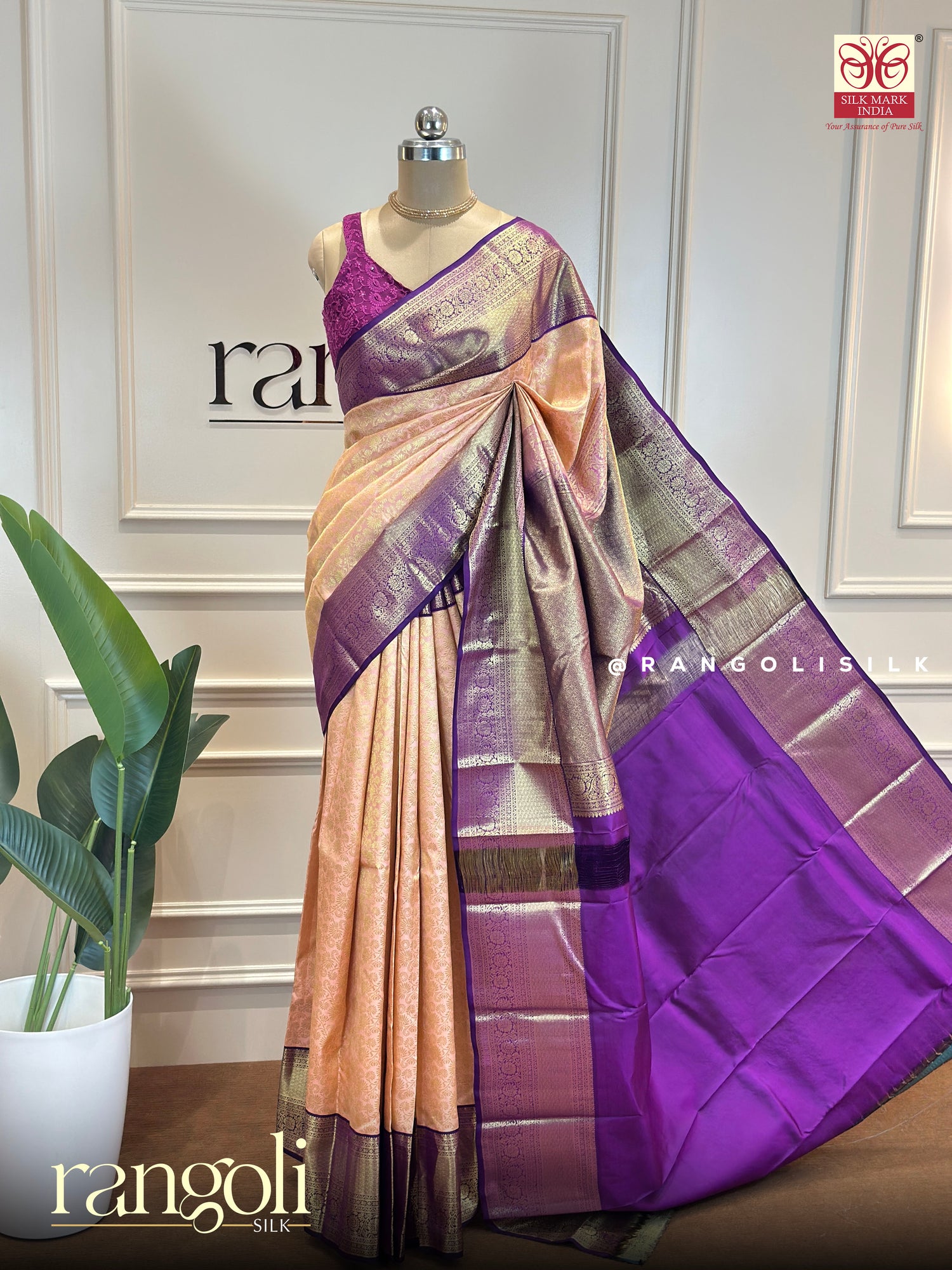 Pure Kanjivaram Silk Saree with Peach Body & Purple Zari Pallu - Post 640