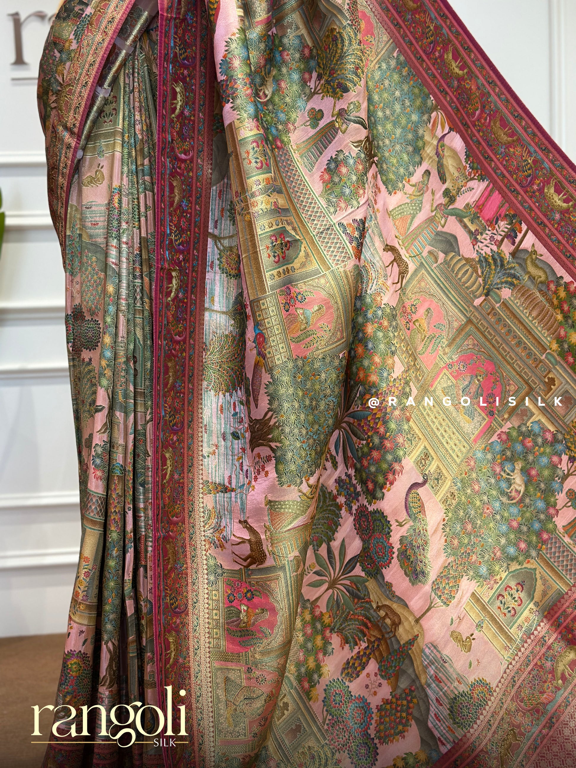 Post 386 - A saree that tells a story—this Banaras tissue saree is woven with enchanting motifs of castles, peacocks, deer, trees, and people. Every inch of this masterpiece narrates a tale from a dreamyland, making it a timeless piece of art perfect for grand celebrations.