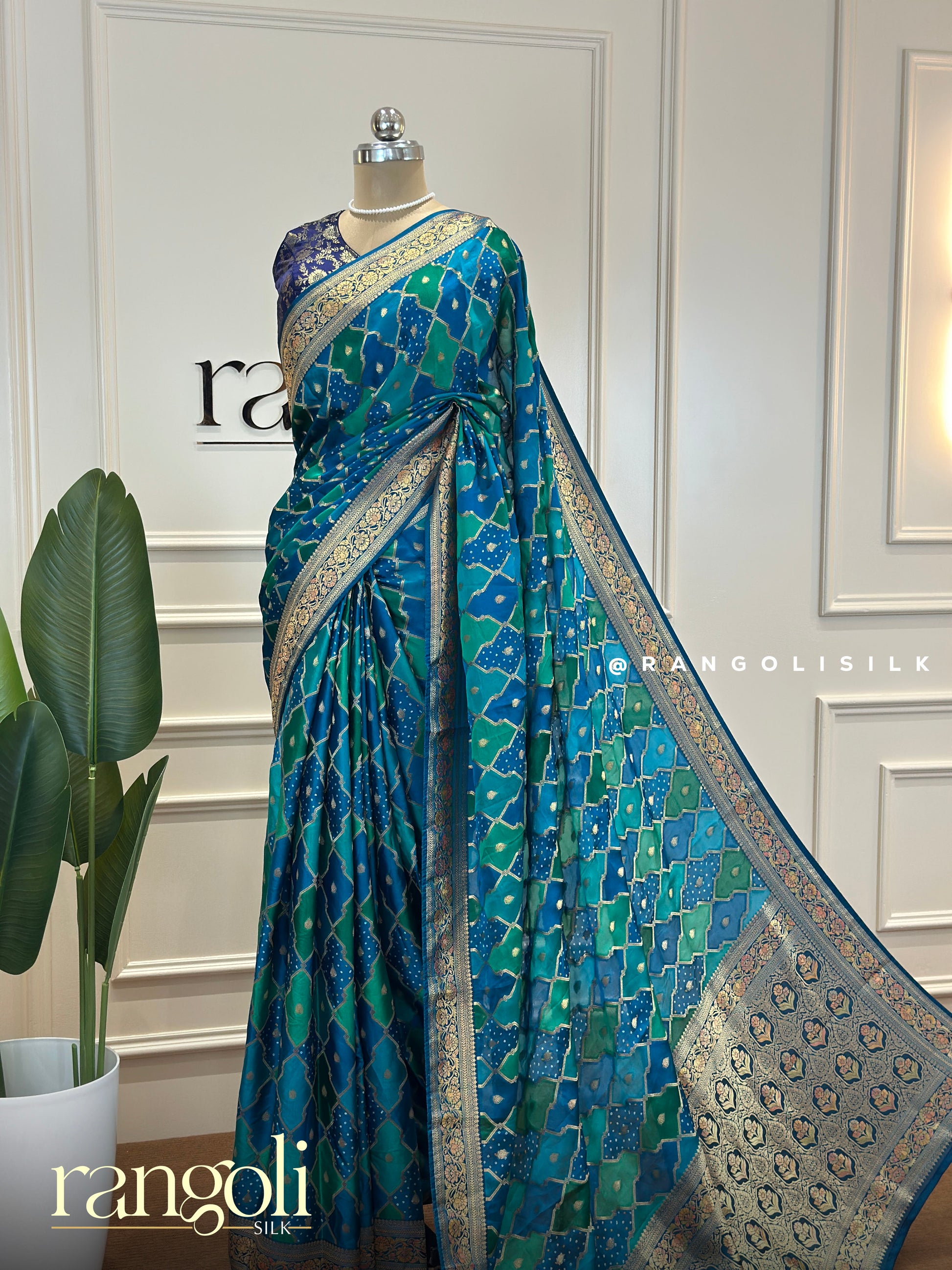 Post 449 - Celebrate timeless elegance with this exquisite Banarasi Bandhani saree, beautifully blending traditional artistry and regal charm. Crafted from luxurious fabric, the saree features classic Bandhani tie-dye patterns enriched with shimmering golden zari borders. The intricate detailing along the edges adds a rich, festive glow, making it perfect for weddings, celebrations, or cultural gatherings. Drape yourself in heritage and sophistication with every fold.