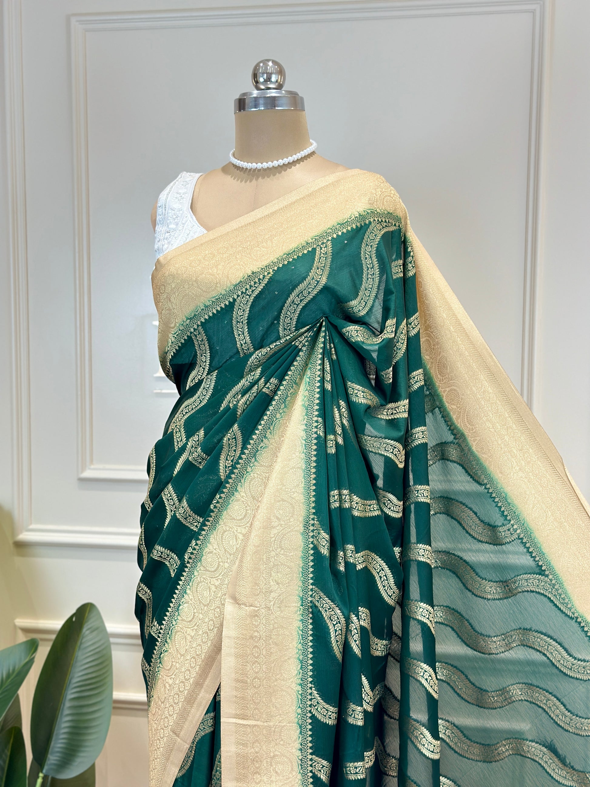 Post 773 - Drape yourself in timeless elegance with this exquisite Banarasi saree crafted in lightweight chiffon georgette, featuring a rich zari woven border and a beautifully detailed wave-patterned pallu. The airy, flowy texture offers effortless grace, while the intricate Banarasi craftsmanship adds a touch of royal charm. Perfect for weddings, festive gatherings, and special occasions, this saree blends traditional artistry with modern sophistication for a truly captivating look.