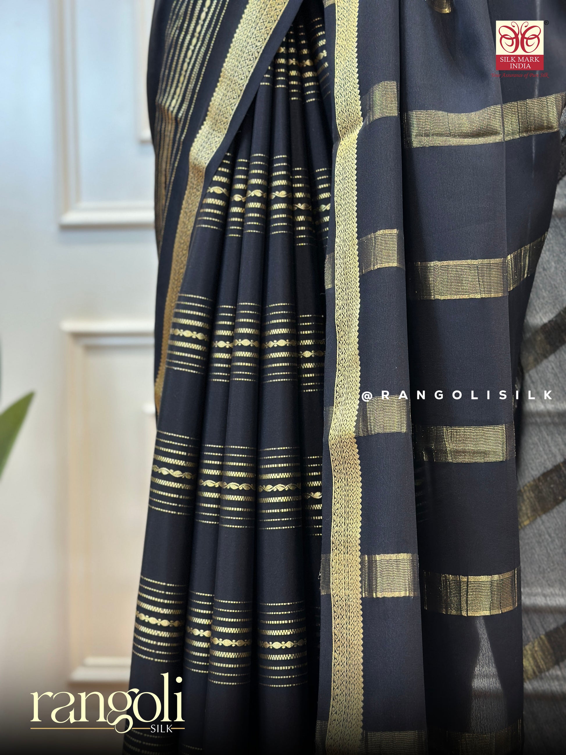 Post 412 - Make a bold and elegant impression with this black pure crepe silk saree, beautifully adorned with intricate gold zari work. Crafted from 100% pure crepe silk and Silk Mark certified, it guarantees authenticity and premium quality. With a fabric thickness of 100 GSM, it's lightweight yet refined—ideal for festive and formal occasions. This timeless piece effortlessly blends traditional artistry with modern sophistication.