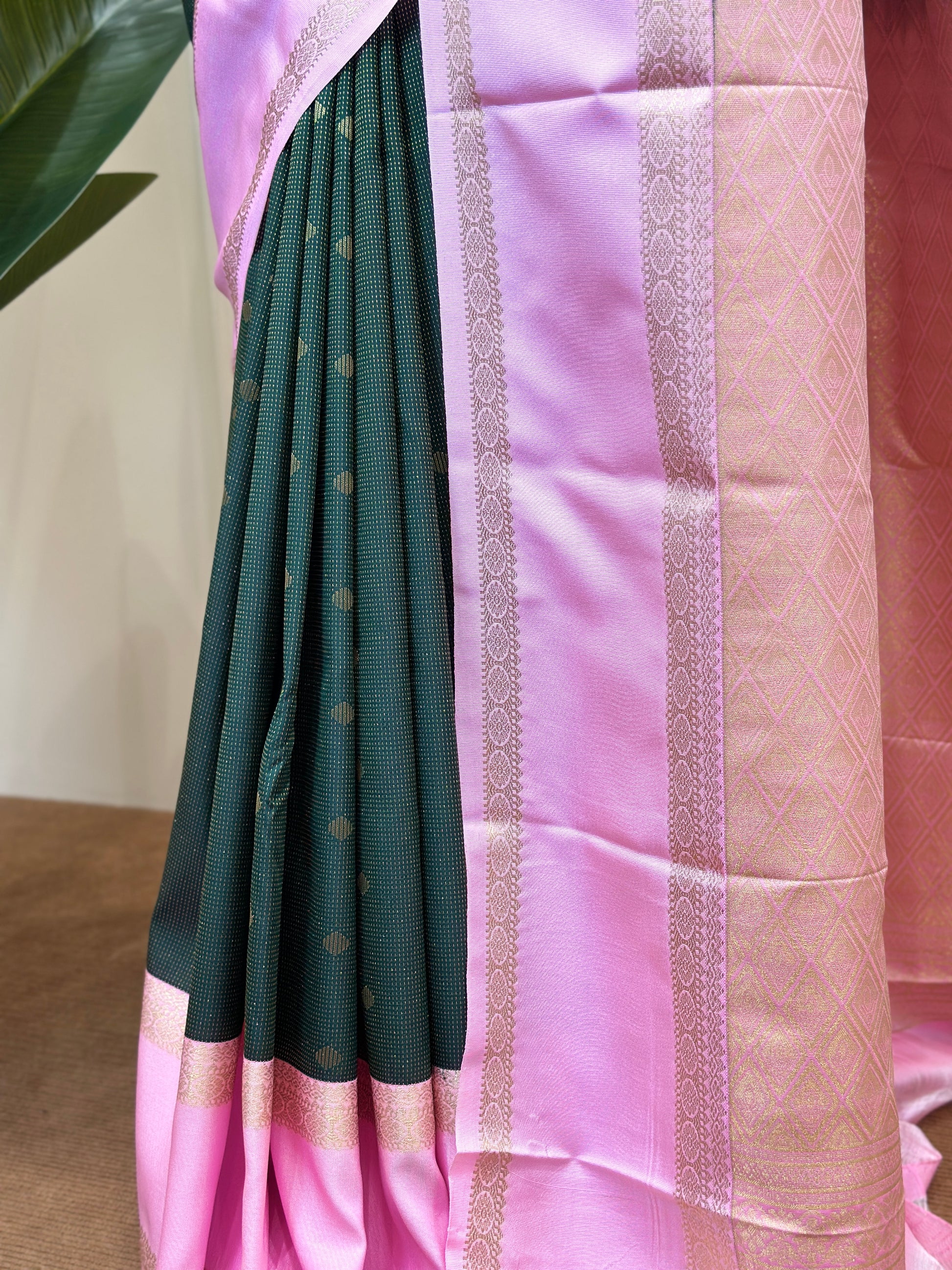 Deep Green & Blush Pink Semi Kanjivaram Silk Saree with Gold Zari Buttas - Post 776