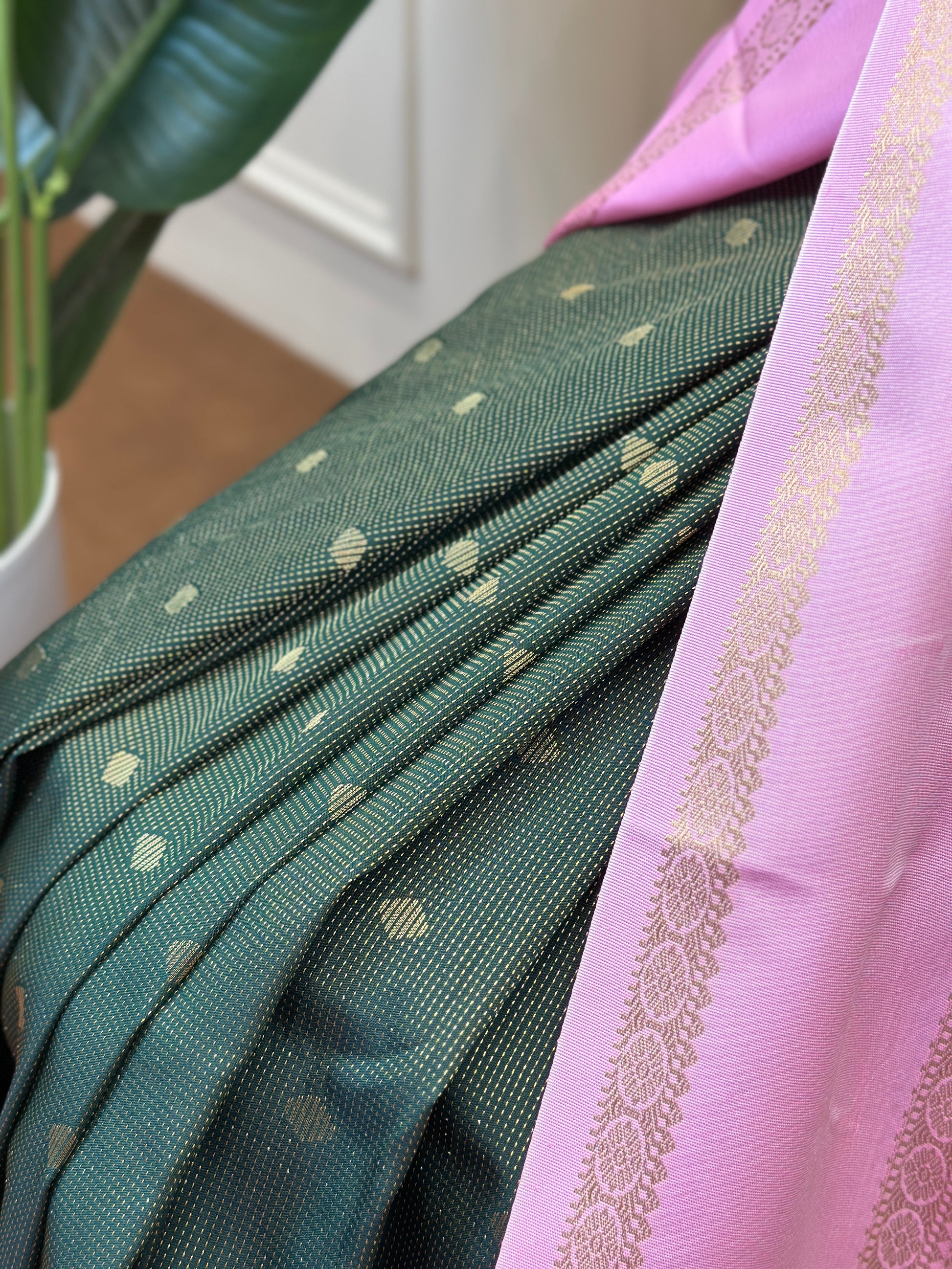 Post 776 - Elegance meets tradition in this stunning semi Kanjivaram silk saree, featuring a rich deep green body beautifully contrasted with a soft blush pink border and pallu. The saree is adorned with delicate gold zari buttas scattered across the fabric, adding a subtle shimmer, while the intricately woven gold zari border enhances its regal charm. The graceful blend of bold and pastel tones, paired with classic craftsmanship, makes this saree a perfect choice for festive celebrations, weddings, and timeless ethnic styling.