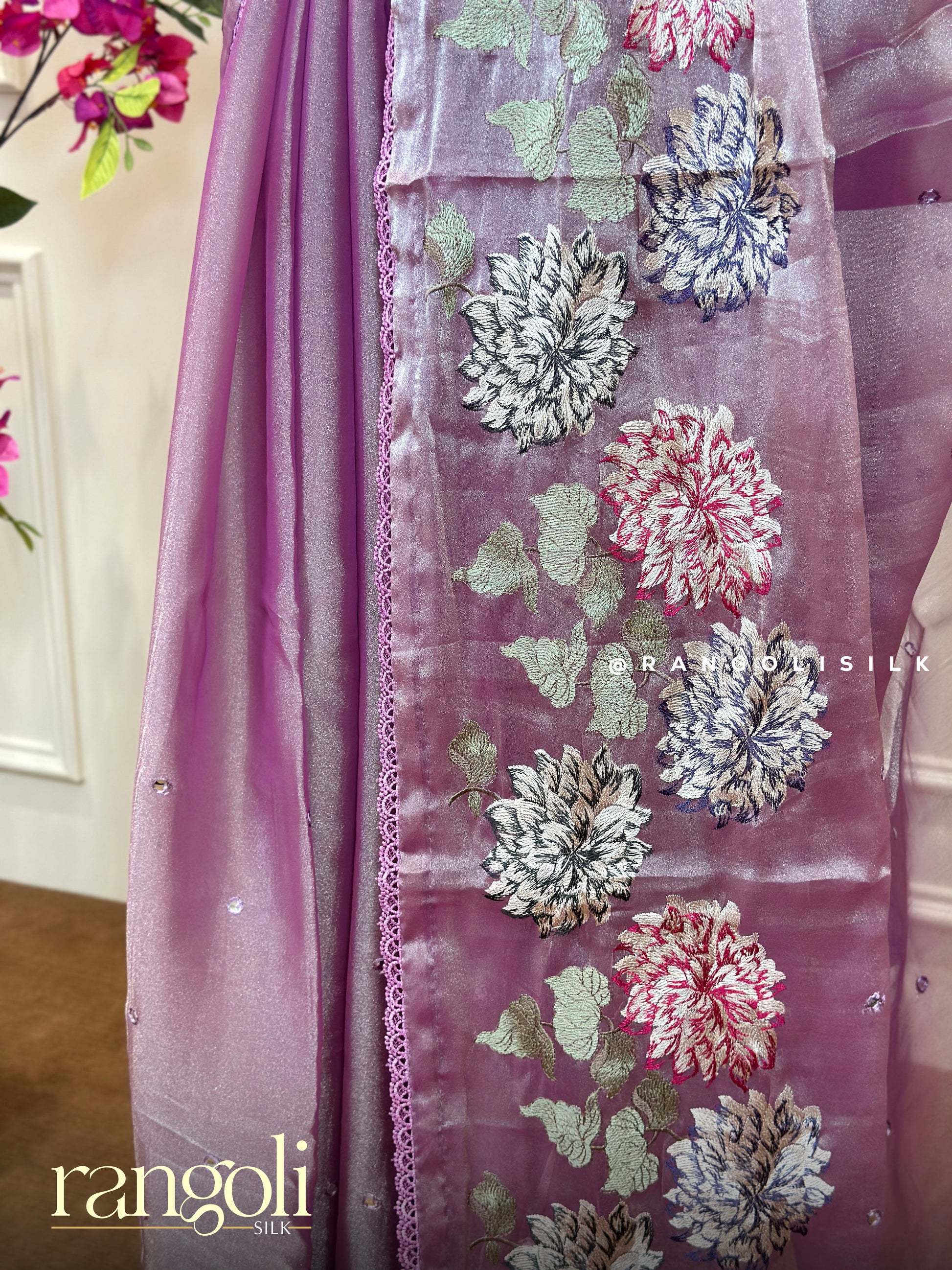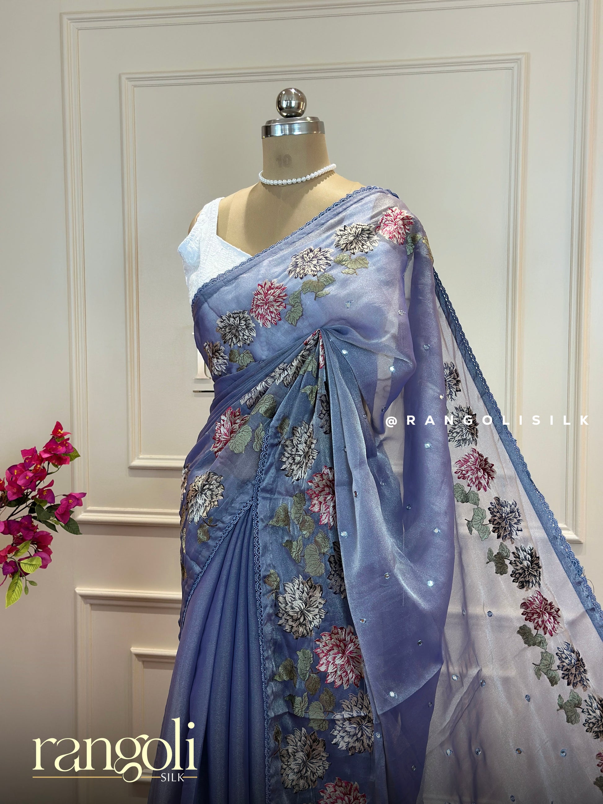 Designer Floral Embroidered Saree in Pastel Lavender & Dusty Blue with Sequin Work - Post 687