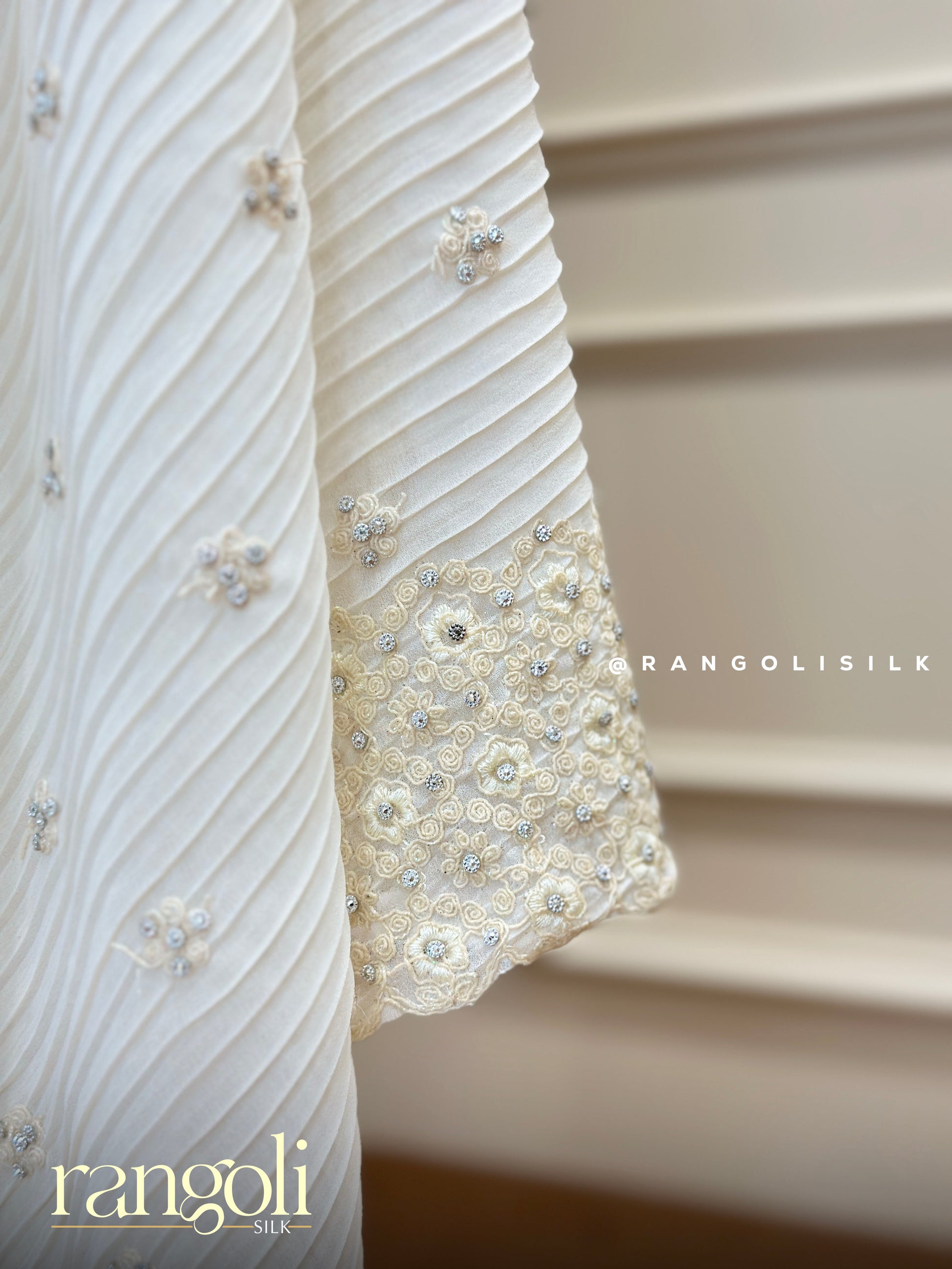Post 398 - This elegant designer saree is crafted from soft pleated fabric, featuring delicate floral work along the border and tiny buttas scattered gracefully across the drape. A perfect blend of texture and detail, ideal for refined occasions.