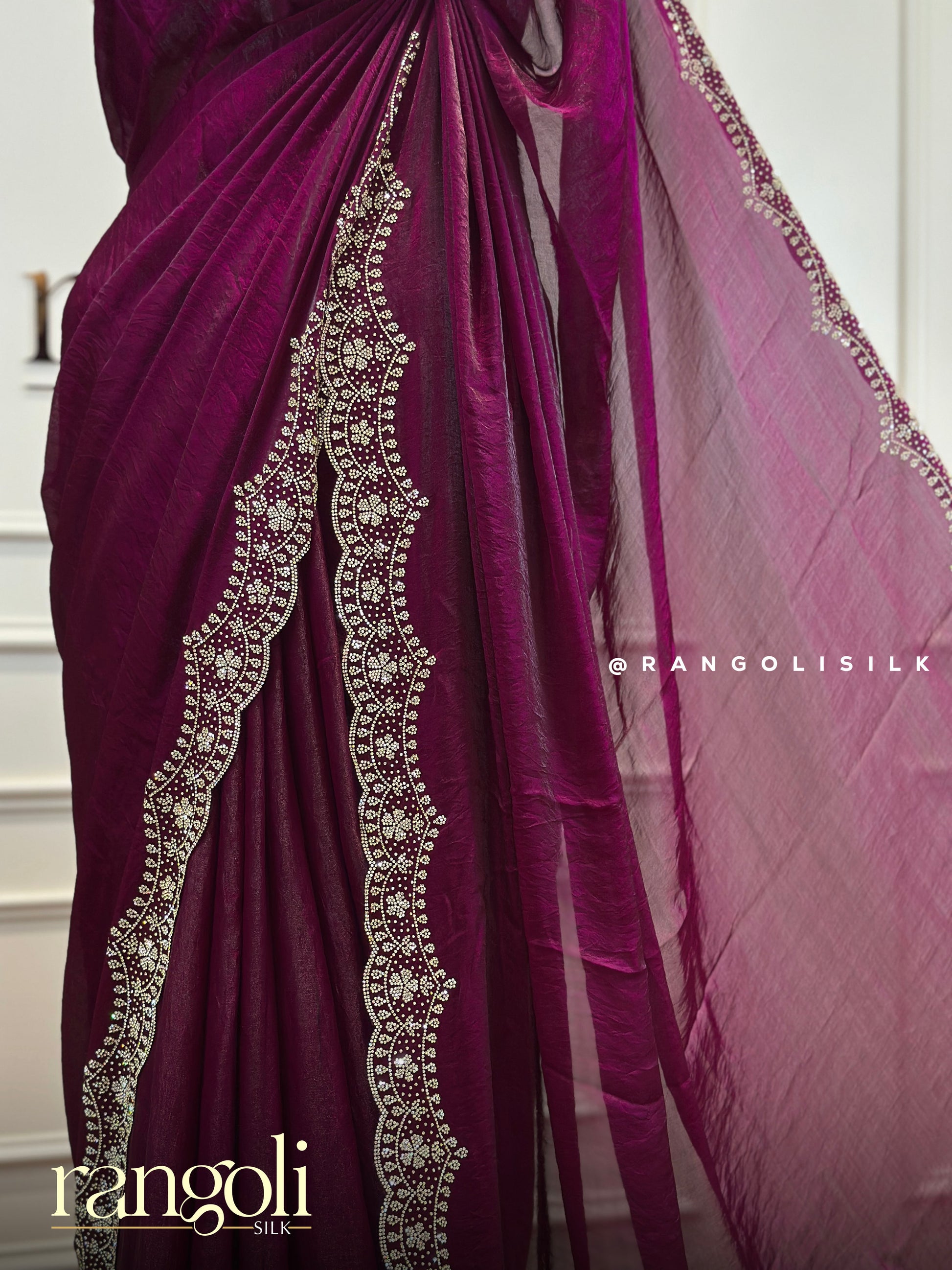 Post 403 - A statement of pure luxury, these designer sarees feature a soft crushed texture enhanced with glimmering rhinestones lining the border. Perfect for evening occasions and celebrations, they offer a blend of elegance and sparkle.
