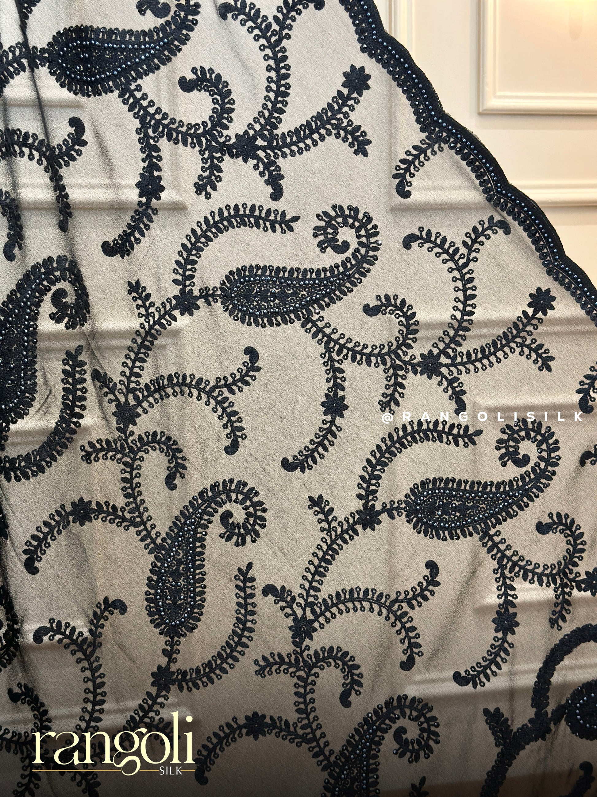 Post 741 - Elevate your look with this stunning designer black saree, crafted in lightweight chiffon that drapes effortlessly and moves with grace. The rich black hue paired with refined detailing gives it a timeless elegance, making it an ideal choice for evening occasions, celebrations, or when you simply want to make a sophisticated style statement.