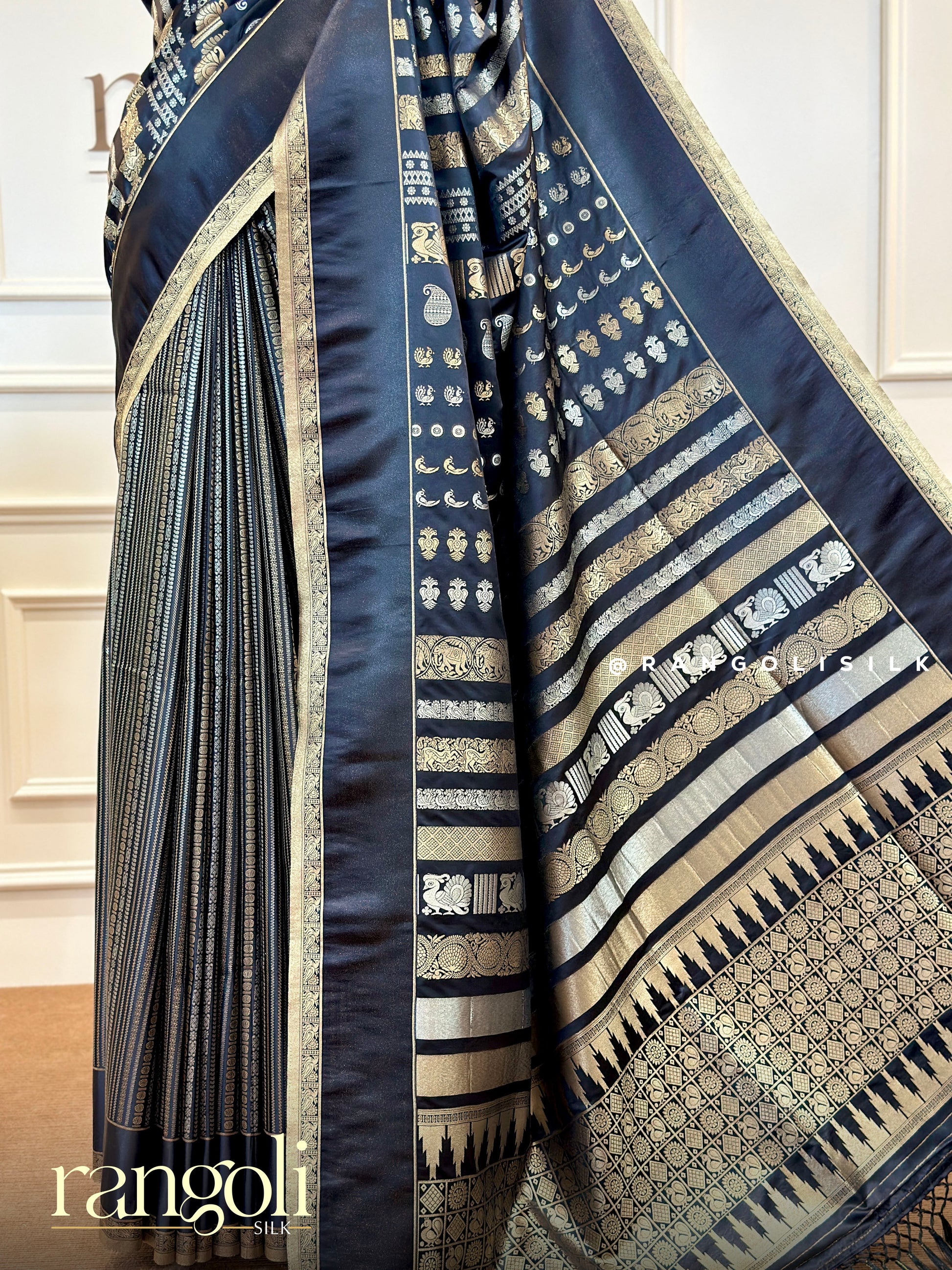 Post 548 - Grace in every drape! This elegant black semi silk saree with rich zari detailing is a true festive stunner! Perfect pick to shine bright this Dasara and embrace the royal charm of Mysore Dasara tradition.