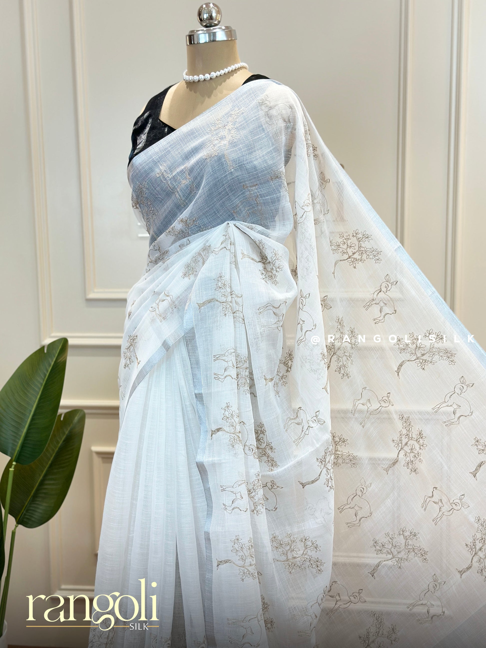 Post 520 - Elegance meets simplicity in this cotton saree, adorned with delicate deer and tree motifs that whisper stories of nature’s gentle charm. The soft, breathable fabric makes it perfect for every occasion - whether it’s a casual day out or a small festive gathering.