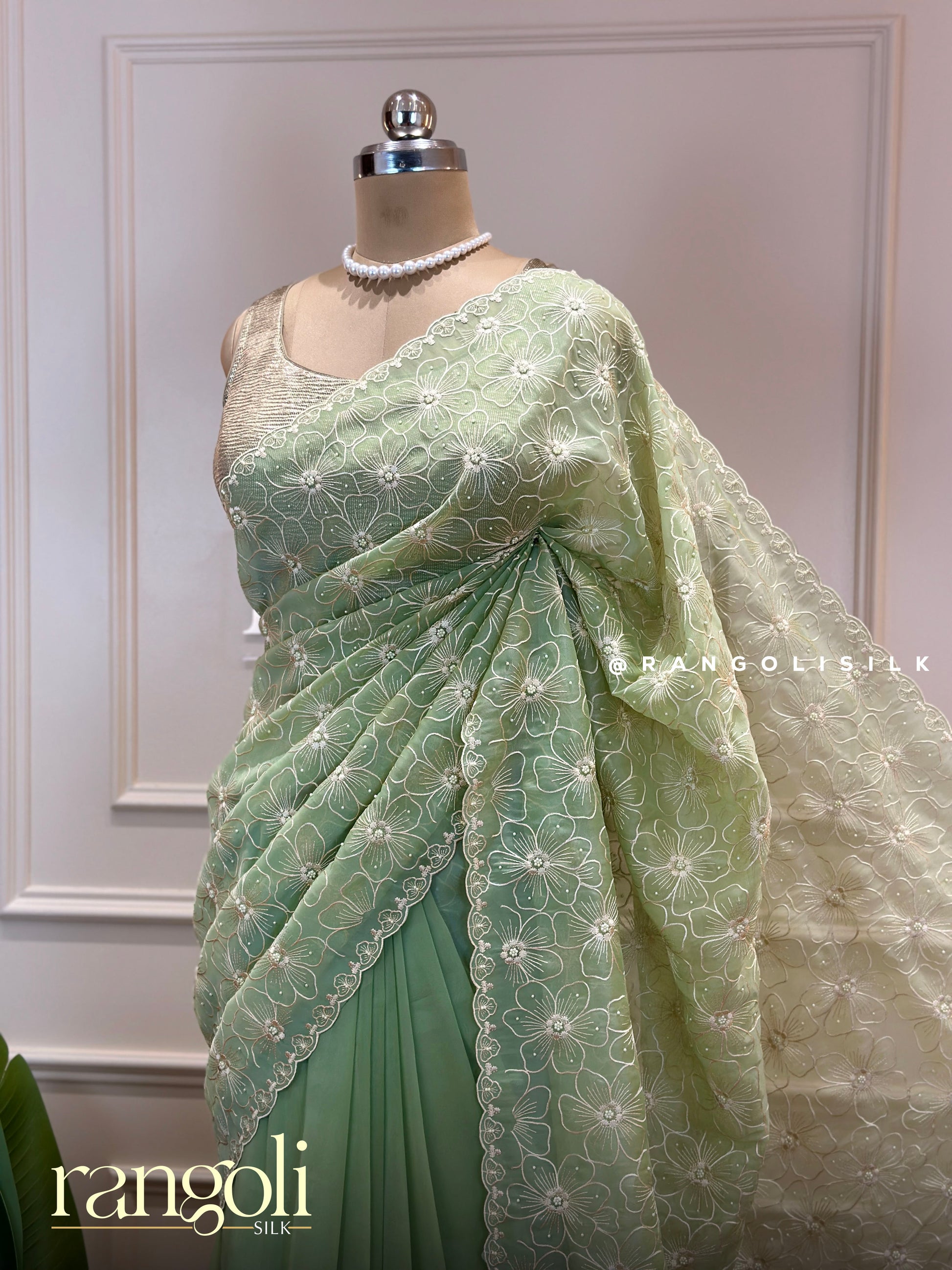 Post 579 - These designer sarees in pastel shades, pink, green and yellow are a celebration of grace in every drape. Adorned with intricate floral embroidery, each saree captures a timeless appeal while keeping it effortlessly modern. Perfect for festive gatherings, weddings, or special occasions. Colours may vary slightly depending on lighting conditions and screen display variations .