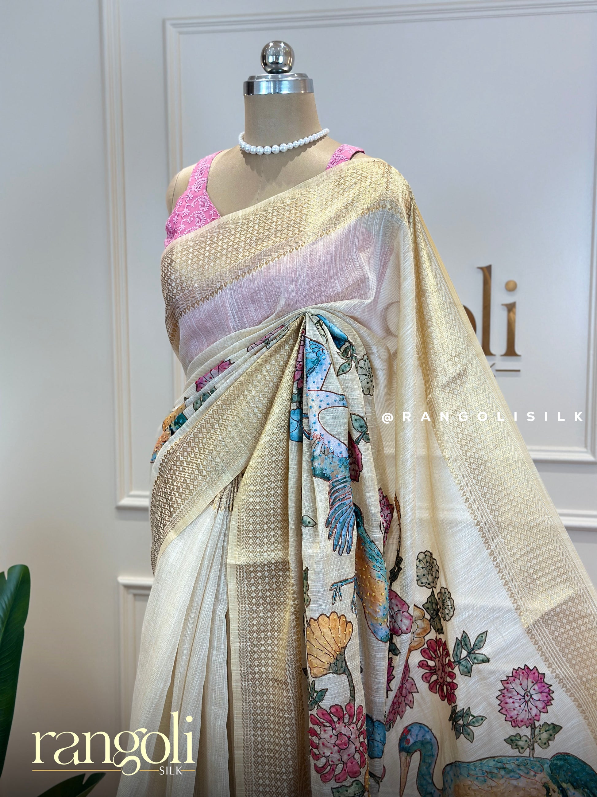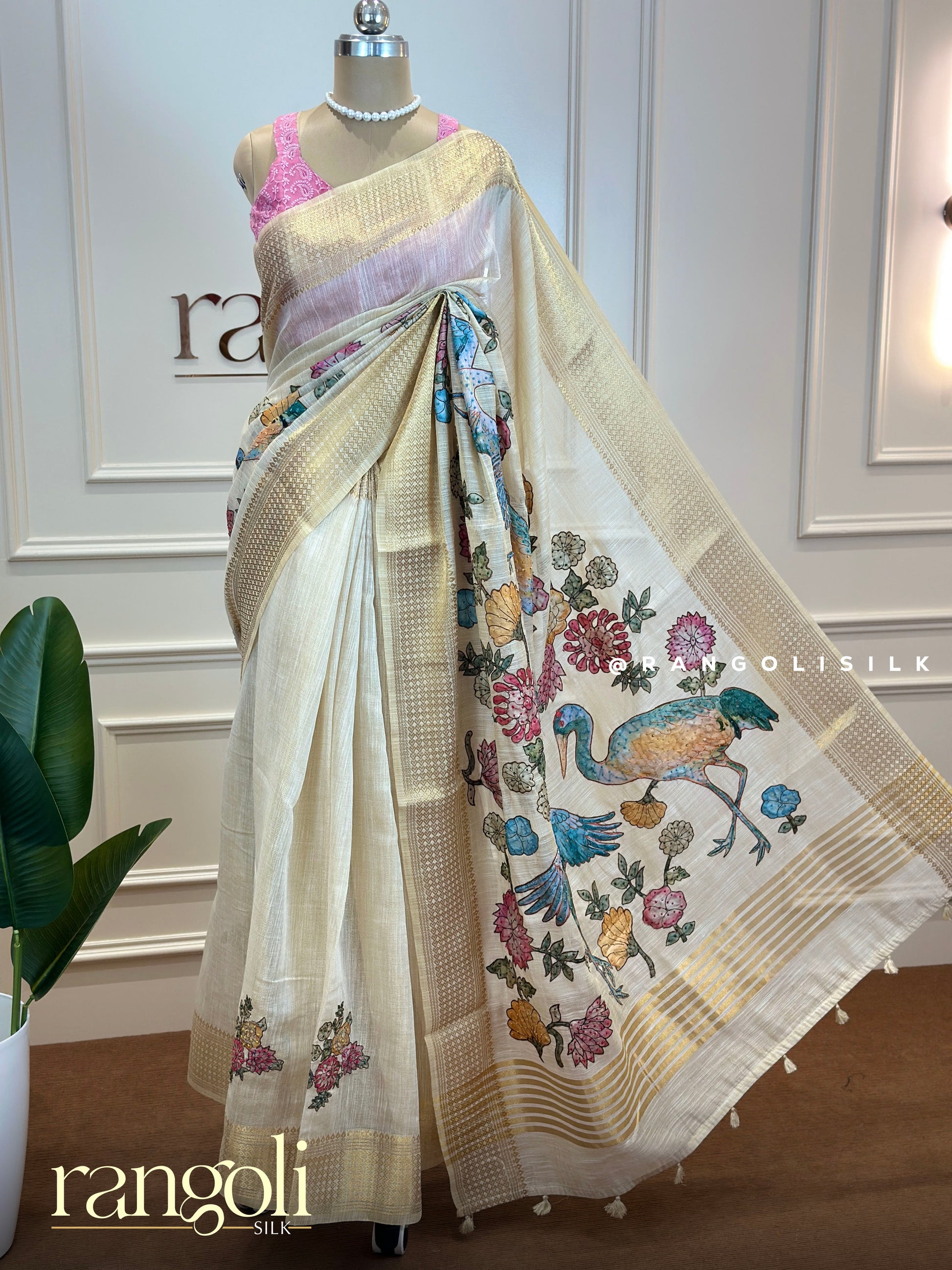 Post 696 - Grace woven in comfort! This cotton saree is a perfect blend of elegance and ease, featuring a beautiful handcrafted pattern inspired by nature. The soothing ivory-beige base is enhanced with soft golden borders and vibrant multicolour floral and bird motifs that add a charming artistic touch. Light, breathable, and timeless, it’s ideal for both everyday elegance and special moments. Style it effortlessly and let the details speak.
