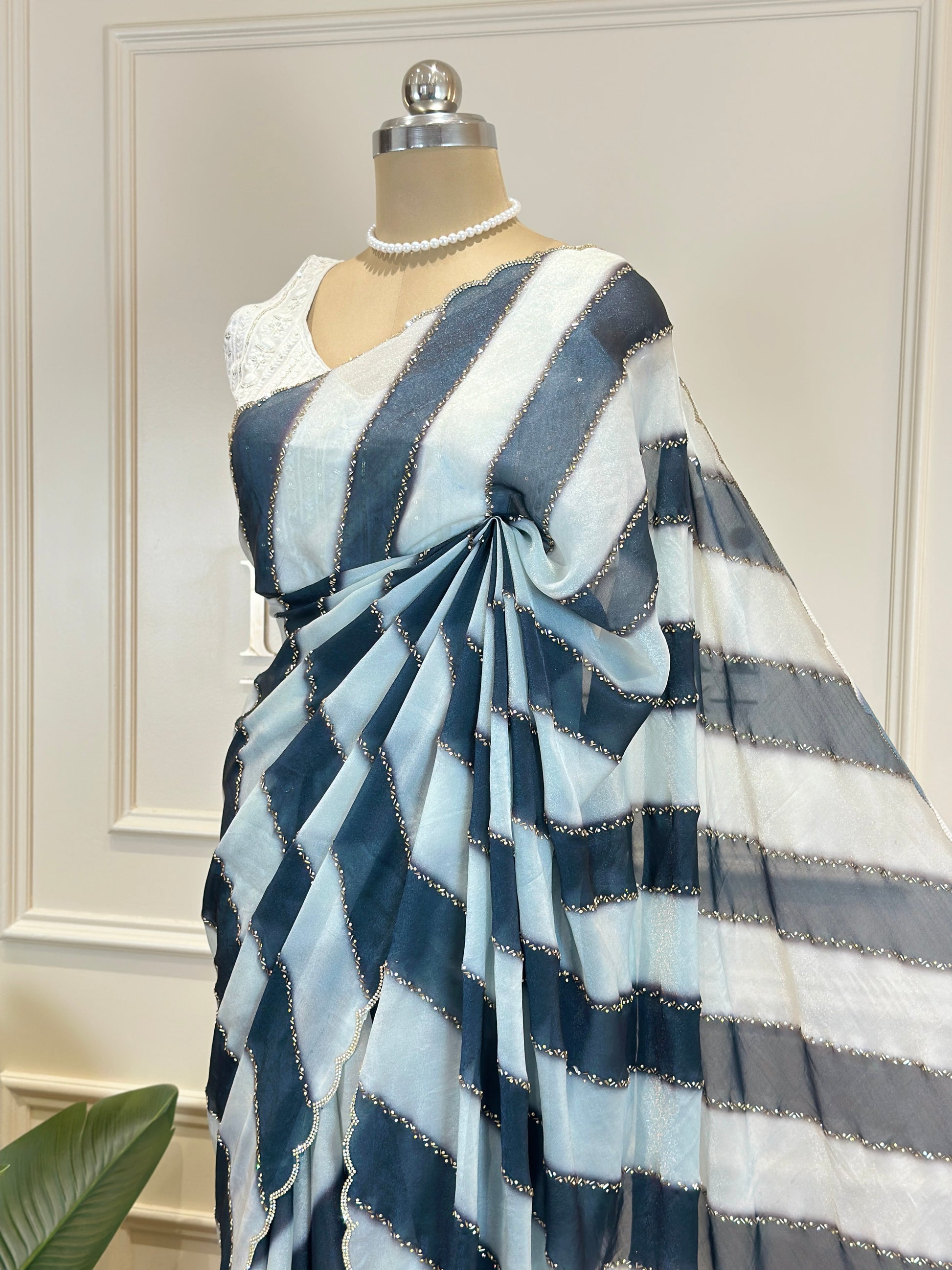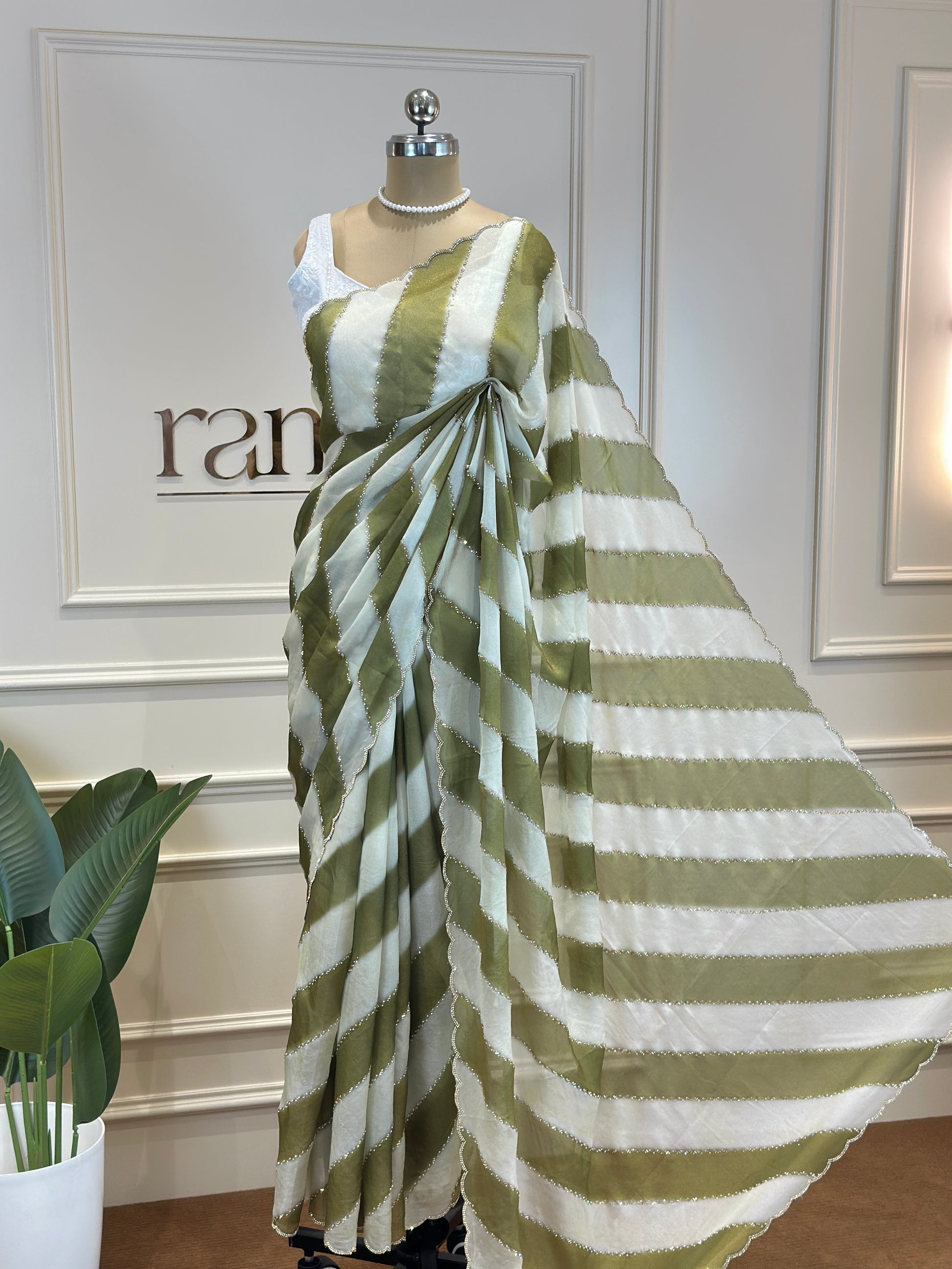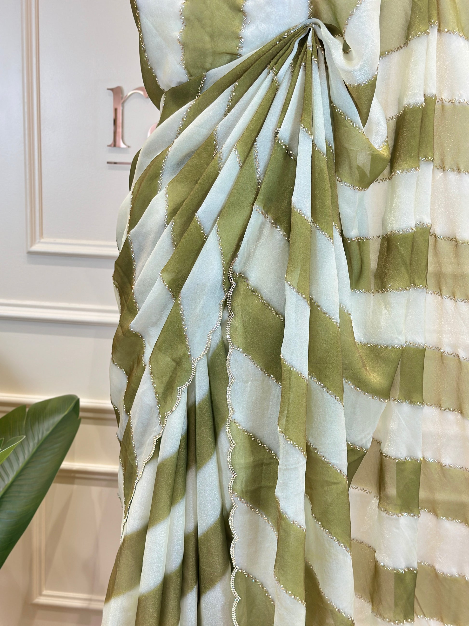Post 758 - A celebration of effortless elegance, these sarees showcase the timeless leheriya pattern, flowing in soft diagonal waves that create graceful movement and visual rhythm. Accented with a delicate scallop border, each drape is finished with subtle shimmer that adds just the right touch of refinement. Available in serene, modern hues, these sarees blend tradition with contemporary charm - perfect for festive gatherings, daytime celebrations, or elegant evenings where understated beauty speaks loudest.