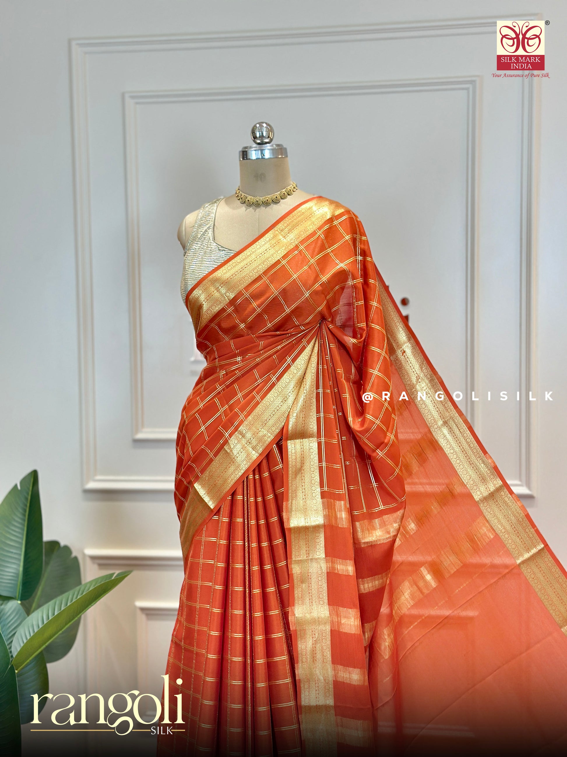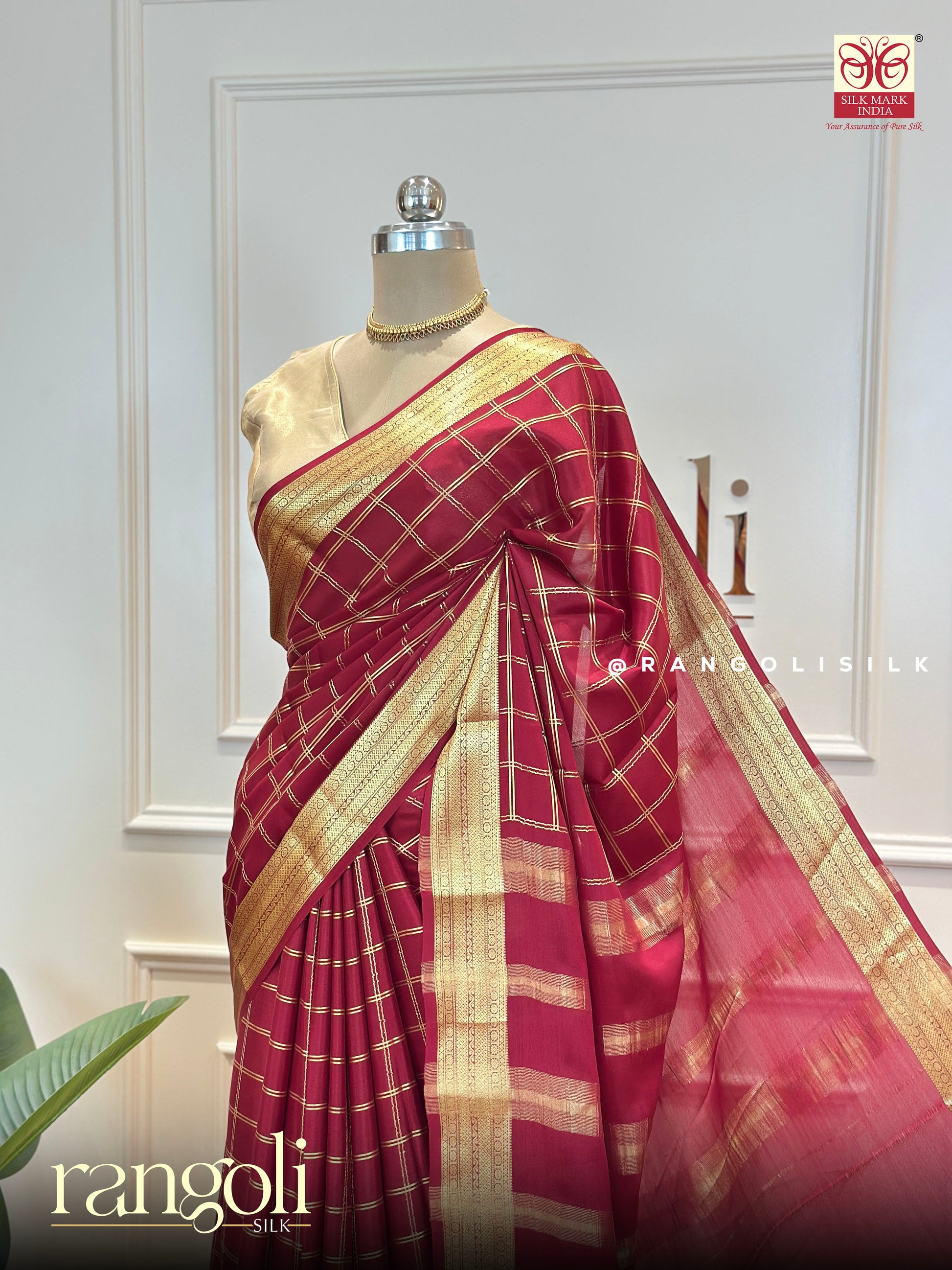 Post 591 - Elegant Pure Mysore Silk sarees made from crepe material with 60 GSM thickness for a smooth, rich drape. Featuring golden zari borders and classic check patterns in maroon, orange, and deep purple shades. Silk Mark Certified, ensuring 100% pure silk authenticity and premium quality.