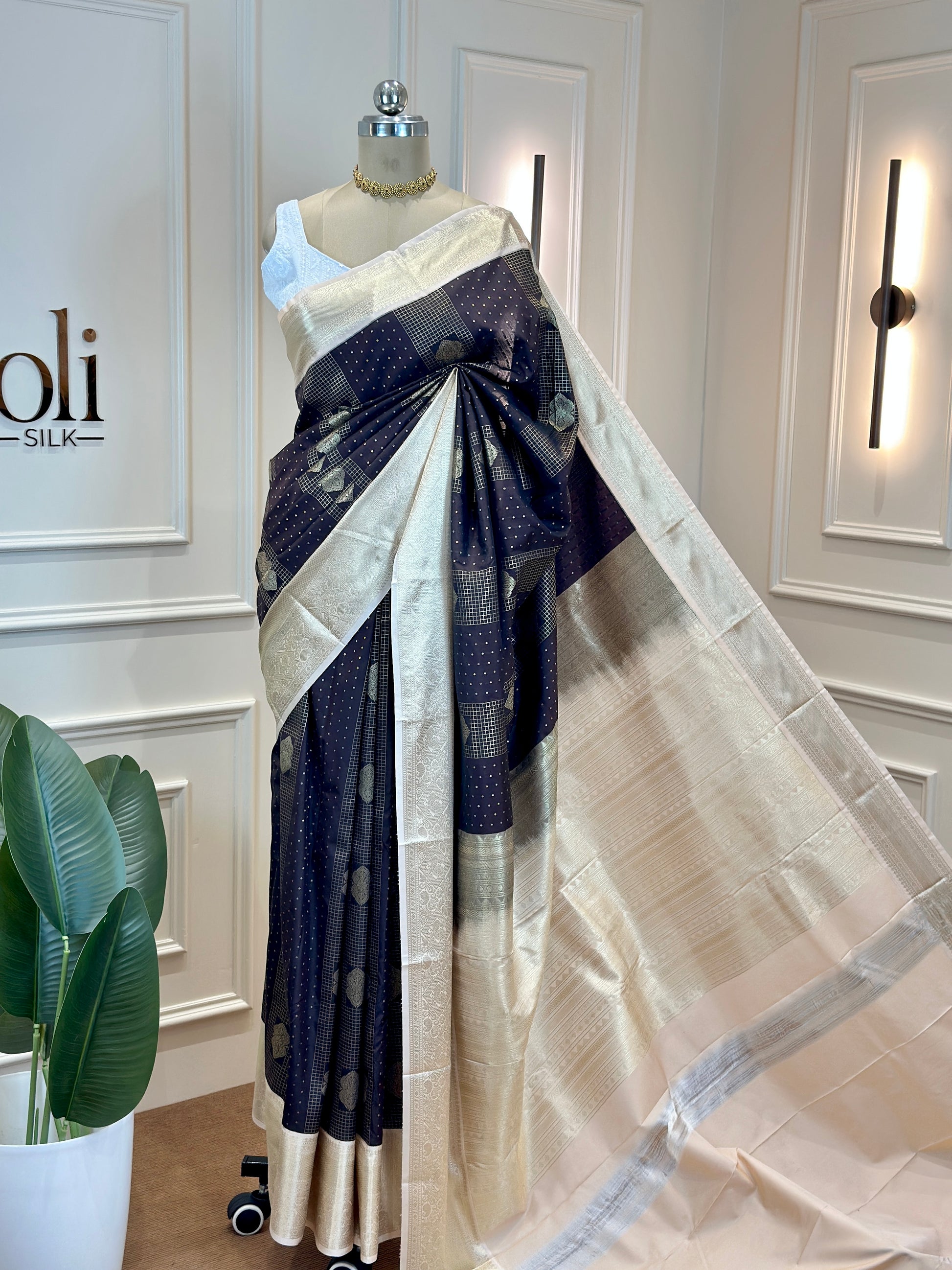 Post 756 - Draped in timeless elegance, this semi Kanjivaram silk saree beautifully blends tradition with modern grace! The rich deep-toned body is perfectly complemented by a luxurious champagne - gold border that adds warmth and grandeur, while the delicate woven motifs enhance its refined charm. Lightweight yet regal, it carries the essence of classic Kanjivaram craftsmanship without the heaviness - making it ideal for festive gatherings, wedding celebrations, and special occasions.