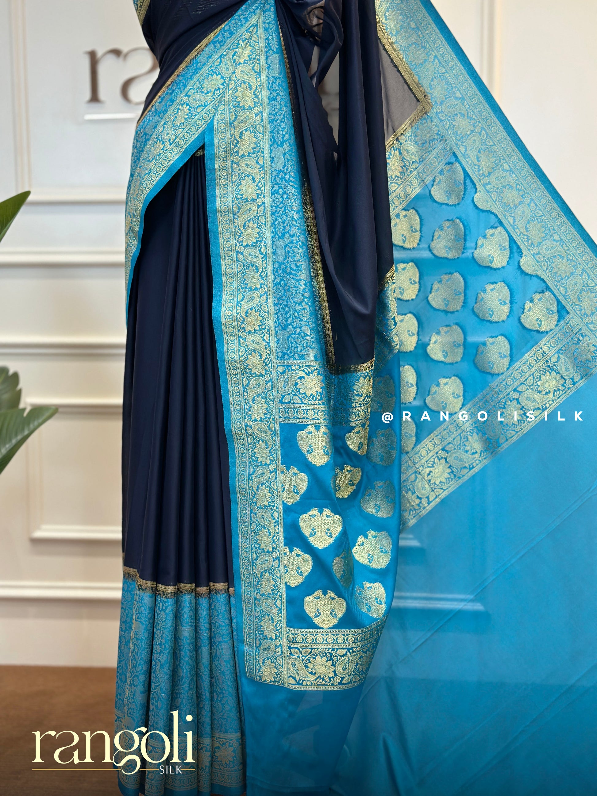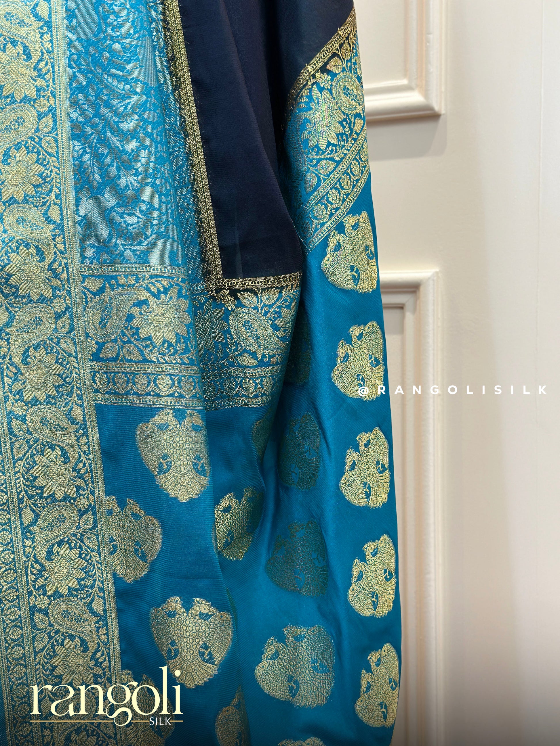 Post 532 - Grace meets tradition in this stunning Semi Mysore Silk saree! The deep navy base beautifully complements the vibrant turquoise blue border and pallu, enriched with intricate golden zari weaving. A perfect blend of elegance and affordability, this saree is ideal for festive occasions, family gatherings, or a graceful evening look.