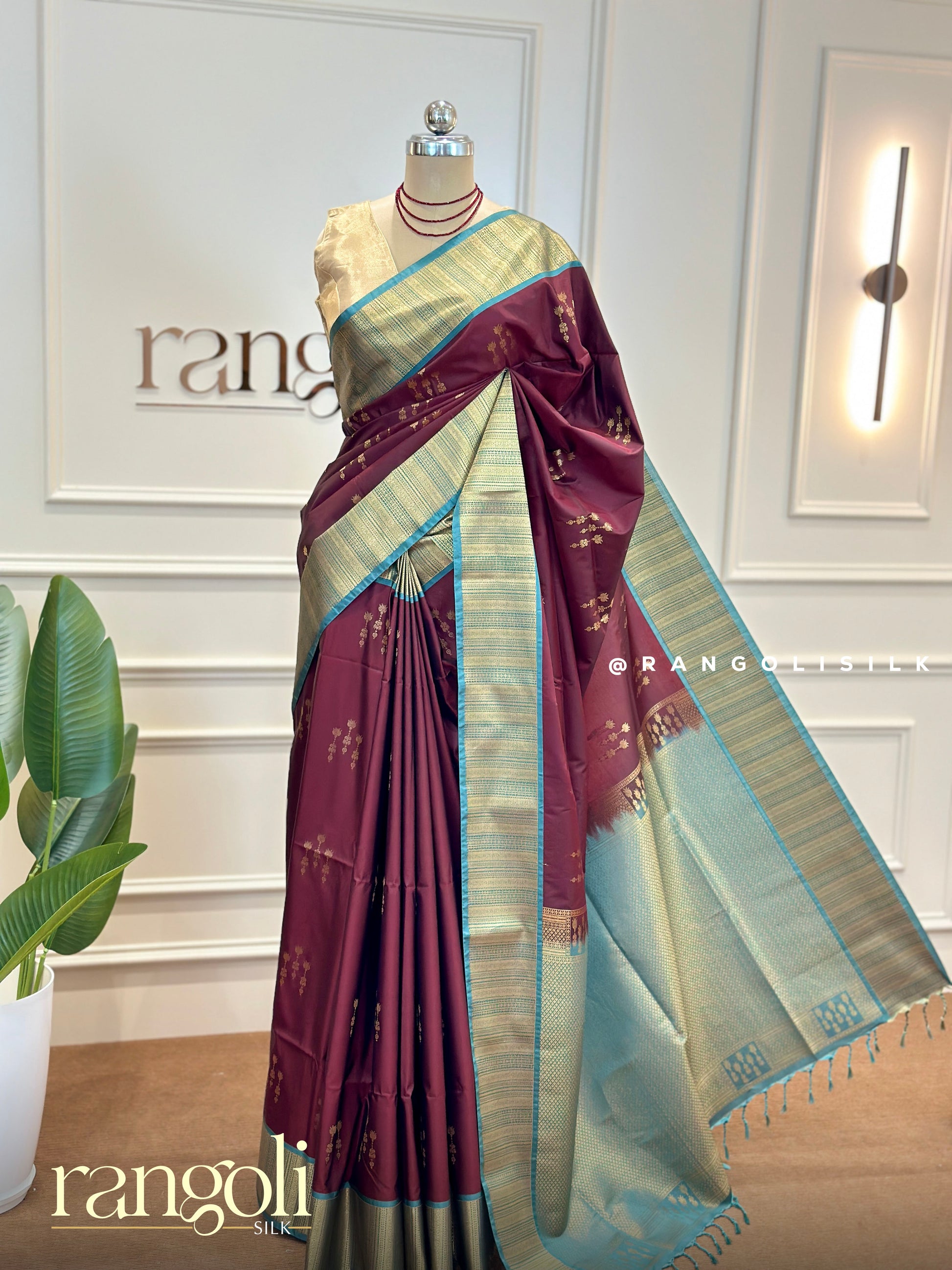 Post 567 - A graceful edit of soft silk sarees in rich maroon, royal blue, and mustard hues, each drape adorned with subtle zari motifs and a contrasting border that adds timeless charm. Perfect for festive gatherings or elegant occasions, these new design sarees bring together tradition and sophistication in every fold.
