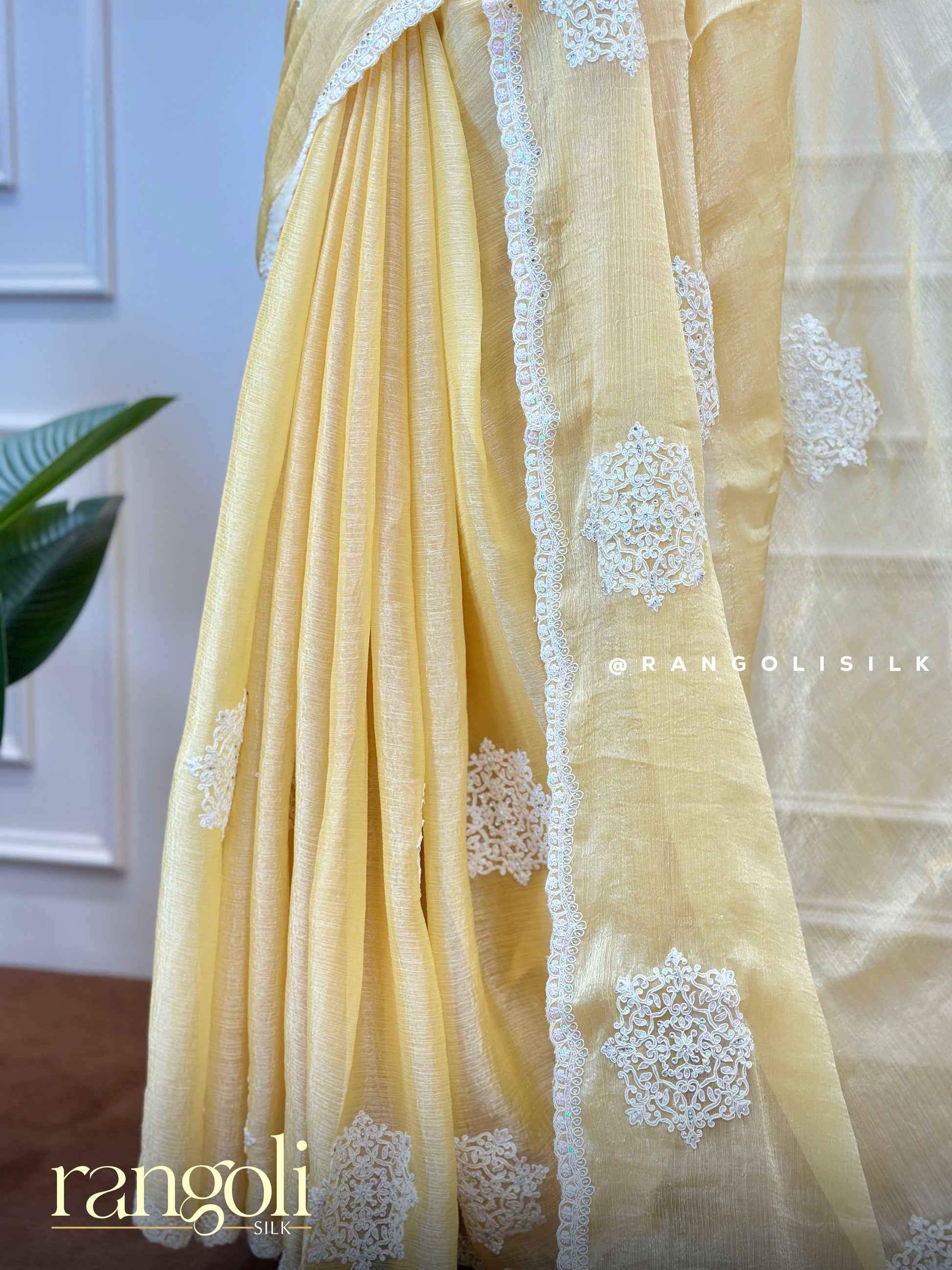 Post 592 - Radiate elegance in this floral embroidered chiffon yellow fancy saree. Perfect for any celebration, this partywear saree blends charm and grace effortlessly.
