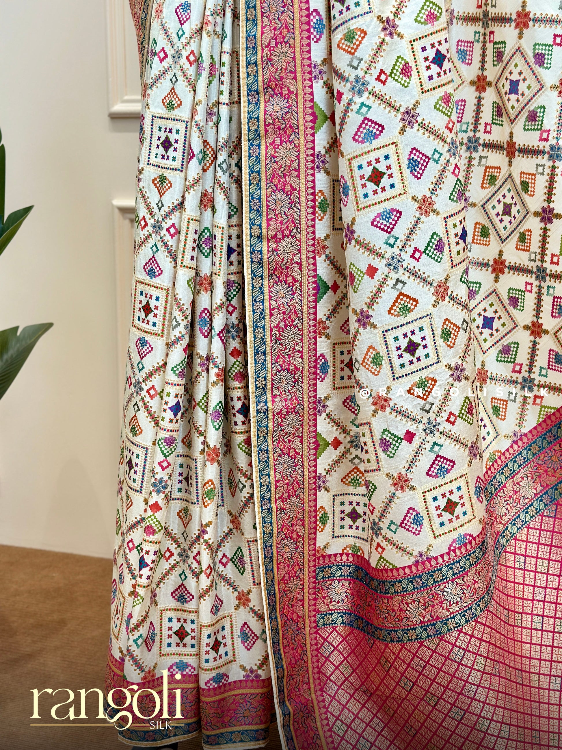 Ivory Banarasi Saree with Multicolour Motifs, Pink Border & Zari Pallu - Post 702