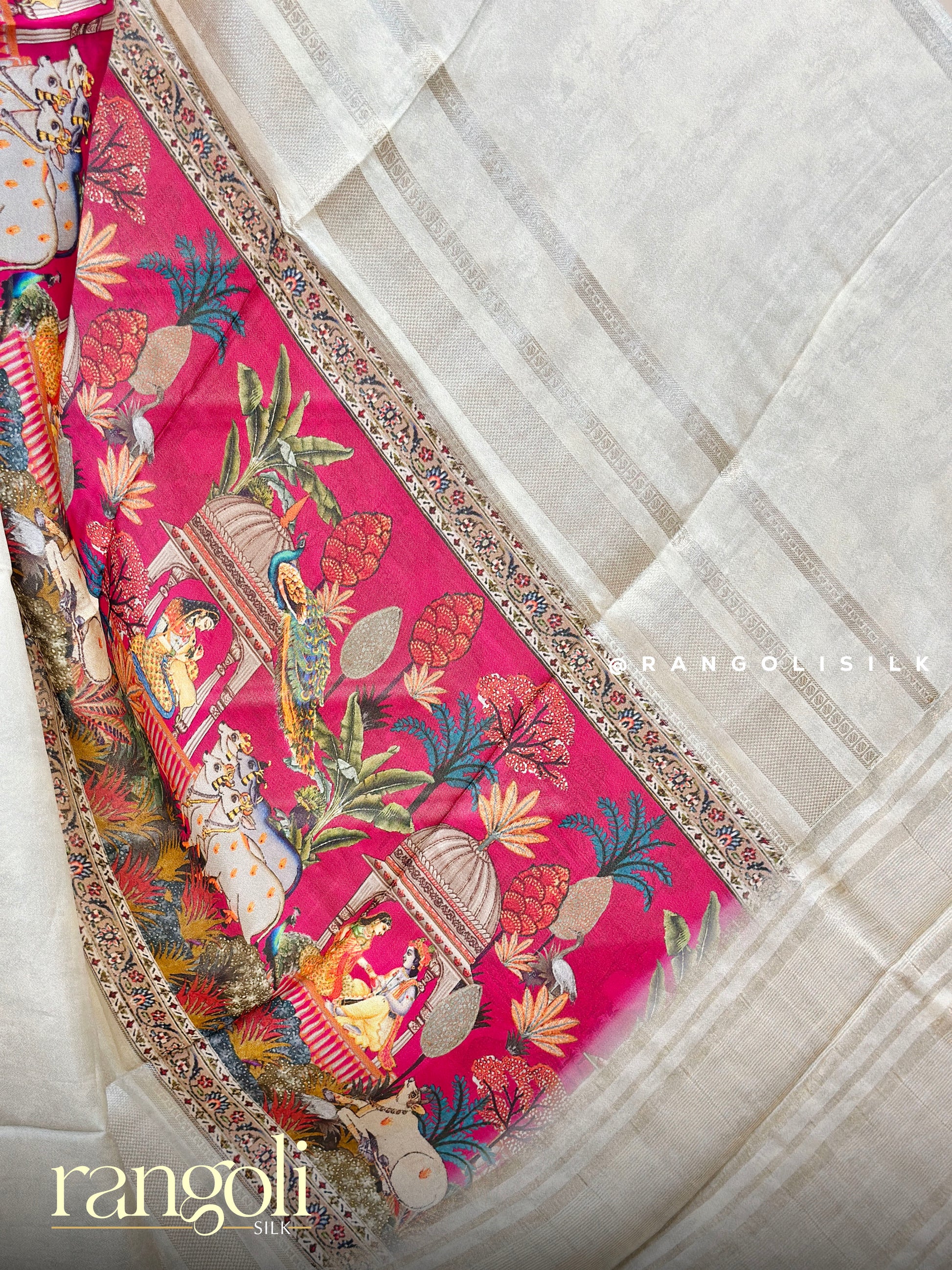 Post 540 - A saree that tells a story in every drape. This beautiful Kalamkari piece beautifully depicts Radha-Krishna, peacocks, trees and cows - symbols of eternal love, divinity, and nature’s harmony! Perfect for festive occasions and spiritual celebrations, this saree radiates grace, devotion, and timeless elegance.