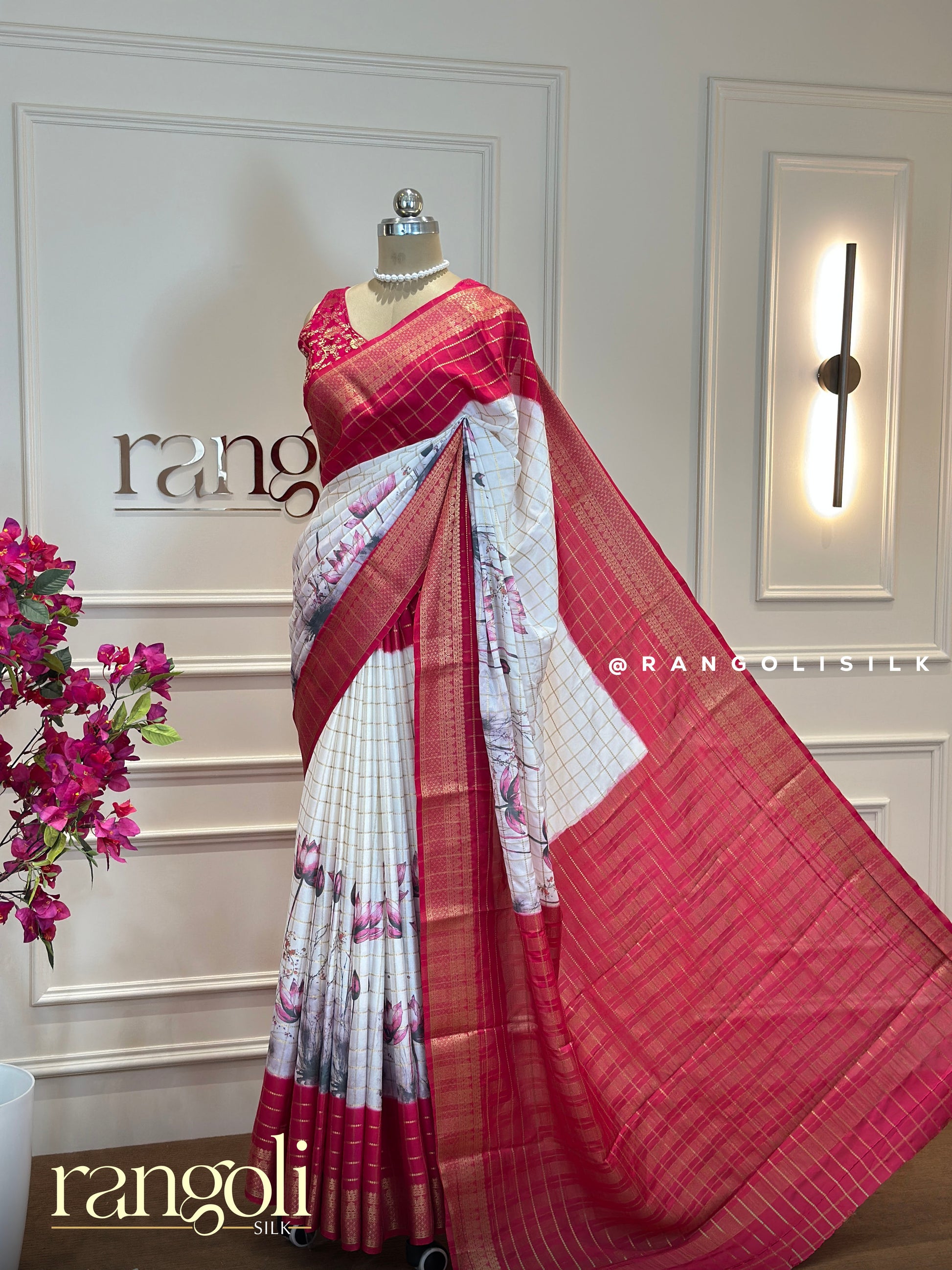 Post 600 - This stunning kalamkari print crepe saree blends traditional artistry with a touch of modern charm. The vibrant pink checks paired with soft floral detailing create a perfect balance of elegance and statement. Lightweight, flowy, and effortlessly chic.