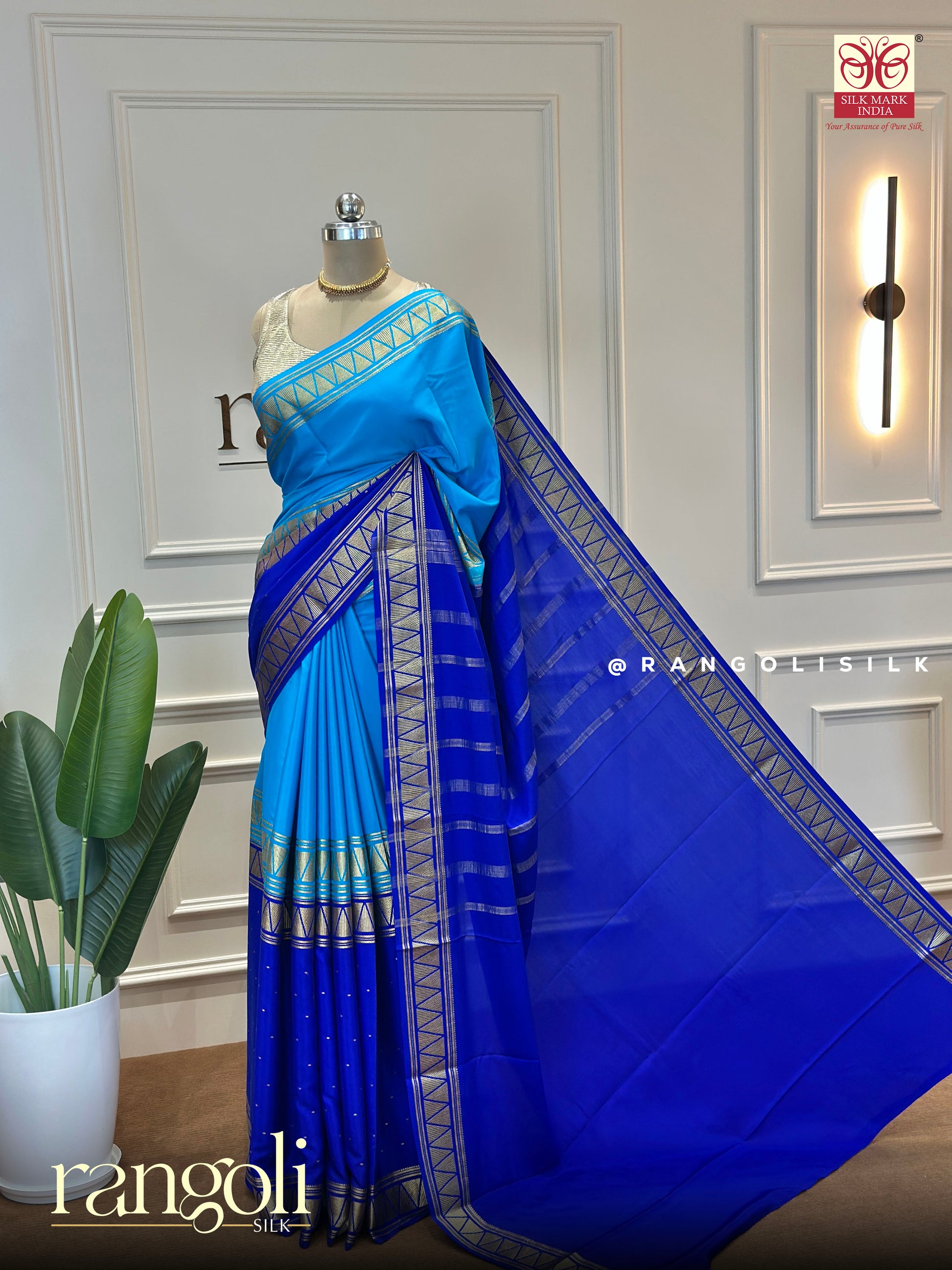 Post 463 - Elevate your ethnic wardrobe with this exquisite pure crepe silk saree, featuring luxurious dual-tone shades and rich zari borders that exude timeless elegance. Crafted from 100% pure crepe silk with a thickness of 100 GSM, this saree offers a graceful drape and smooth texture. It is Silk Mark Certified, assuring you of genuine silk quality and craftsmanship. Perfect for festive occasions, weddings, or elegant soirées.