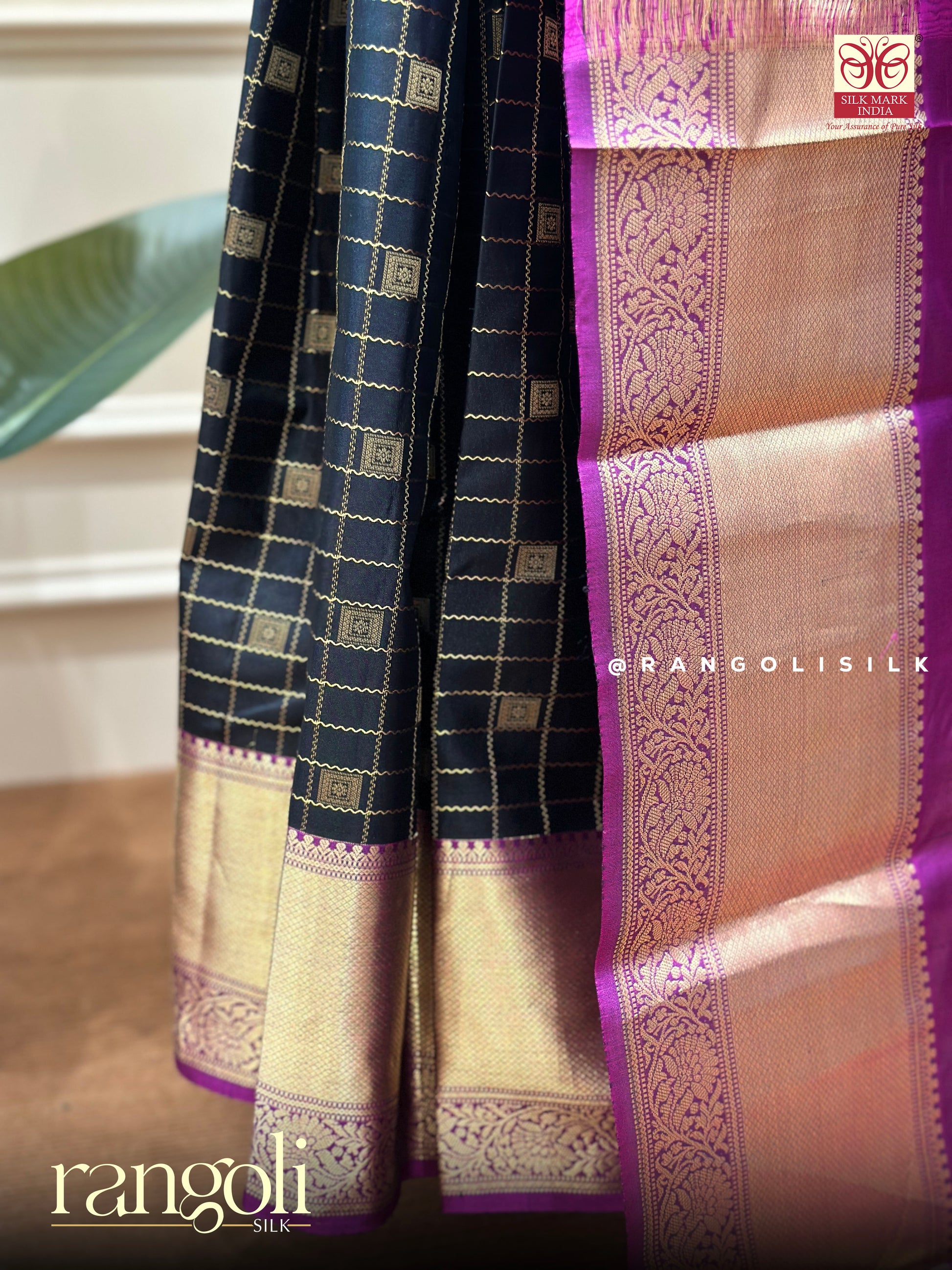 Post 726 - Drape yourself in timeless elegance with this pure Kanjivaram Silk saree, Silk Mark certified for authentic luxury. Featuring a deep ebony-black body adorned with classic gold zari check patterns, it is beautifully contrasted by a rich royal purple and magenta pallu woven with luminous gold borders. The intricate zari craftsmanship, traditional motifs, and regal colour palette come together to create a statement of heritage and refined sophistication.