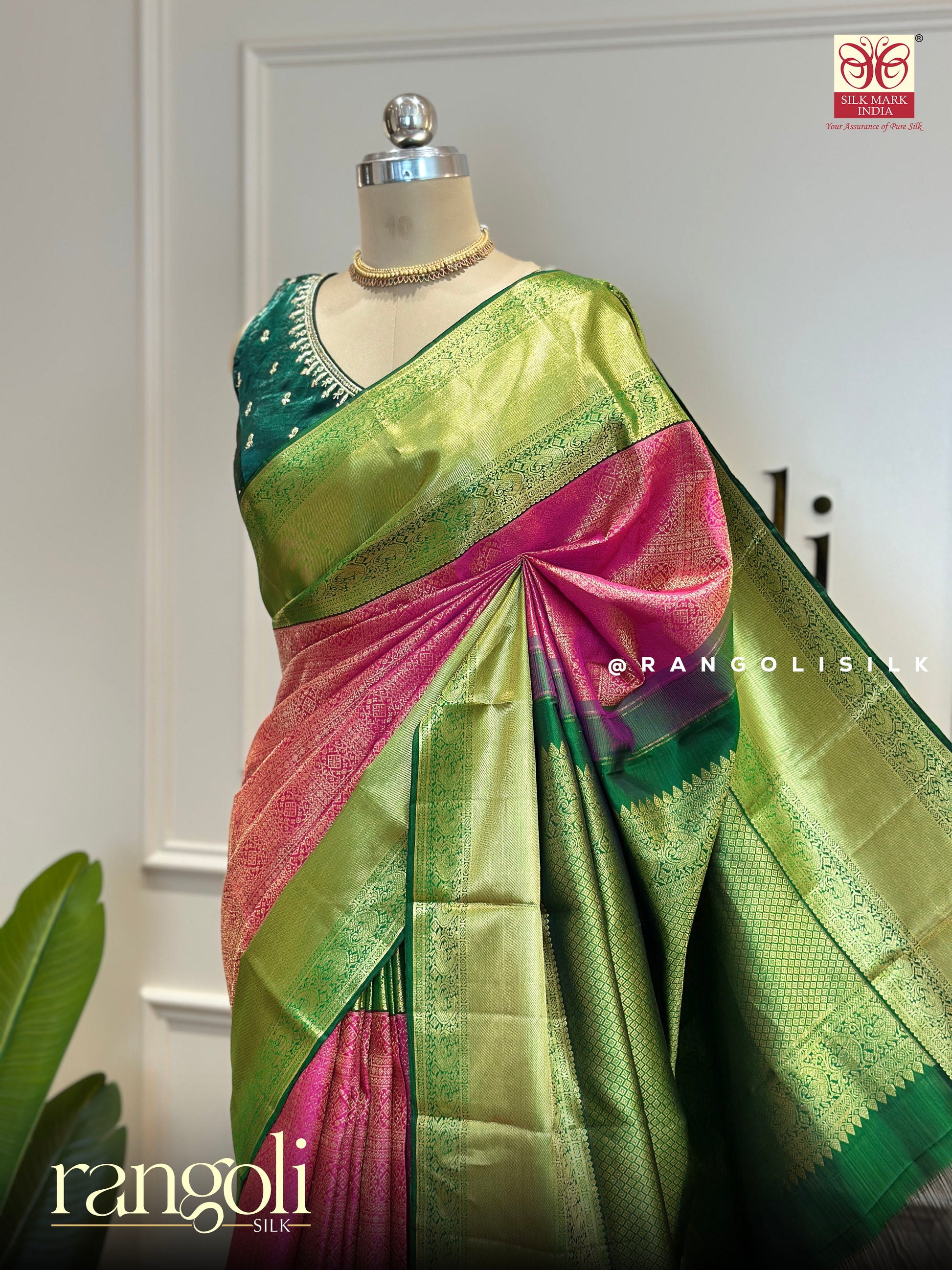 Post 508 - This Pure Kanjivaram Silk Saree comes in a beautiful combination of pink and green with rich zari weaving. The saree is Silk Mark Certified, ensuring authenticity and quality. It includes a matching contrast blouse piece, making it ideal for weddings, festive occasions, and traditional gatherings.