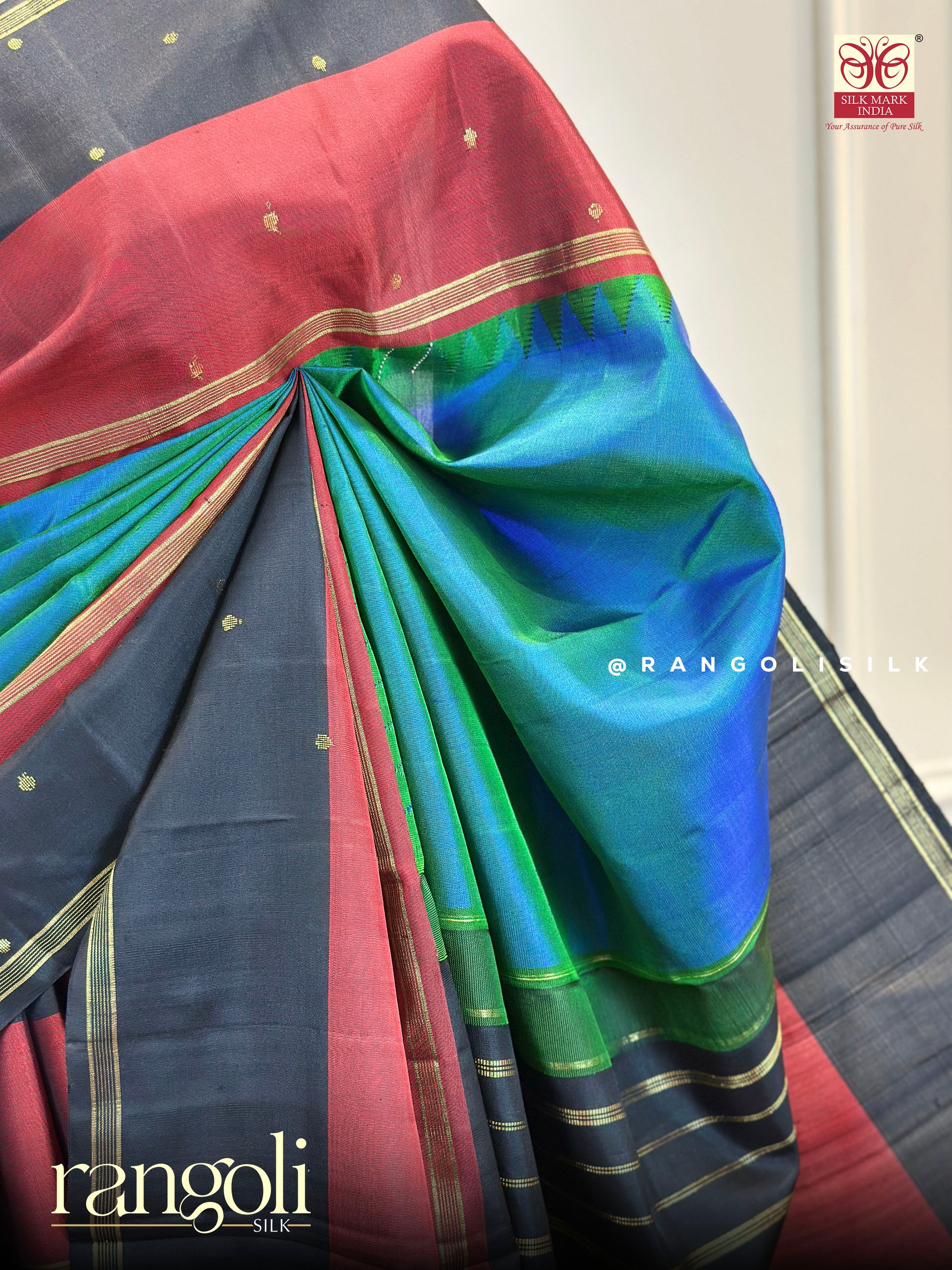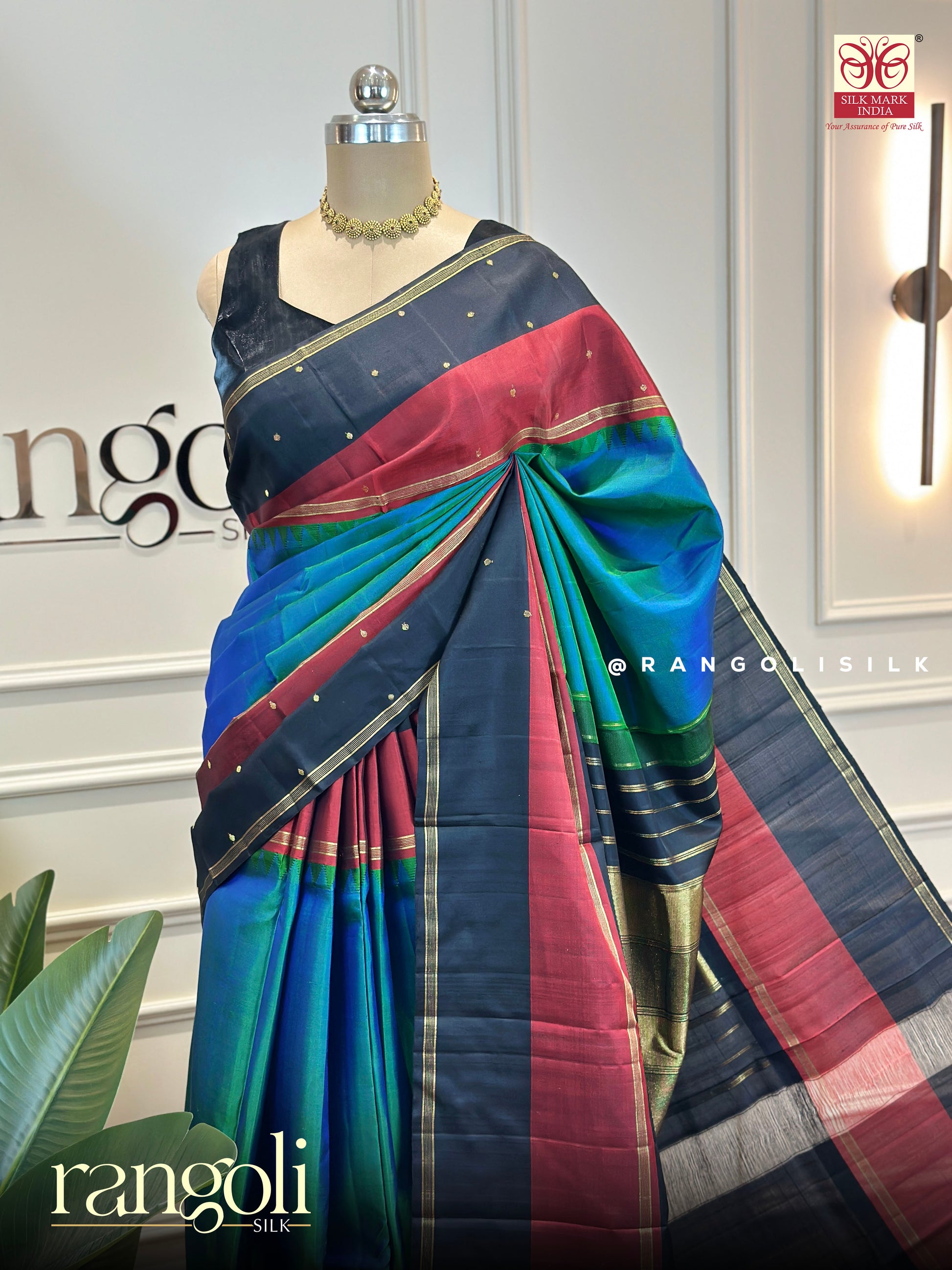 Post 656 - Draped in the timeless beauty of pure Kanjivaram silk, this saree is a celebration of rich heritage and masterful craftsmanship. The striking interplay of deep blues, jewel tones and classic checks! perfect for moments that call for something truly special!