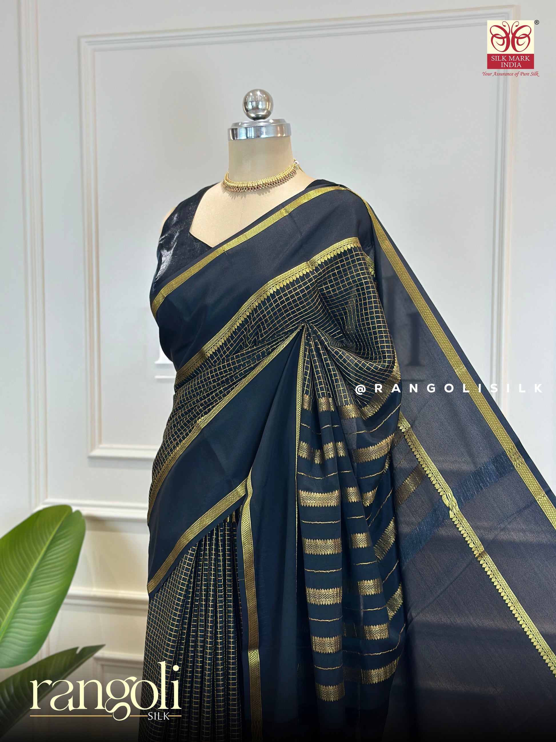 Post 660 - Timeless elegance in Pure Mysore Silk, Silk Mark certified and crafted in a graceful 100 GSM thickness for a rich yet fluid drape. The deep navy blue base is beautifully contrasted with subtle gold-toned checks and borders, creating a classic design that feels refined, regal, and effortlessly sophisticated.