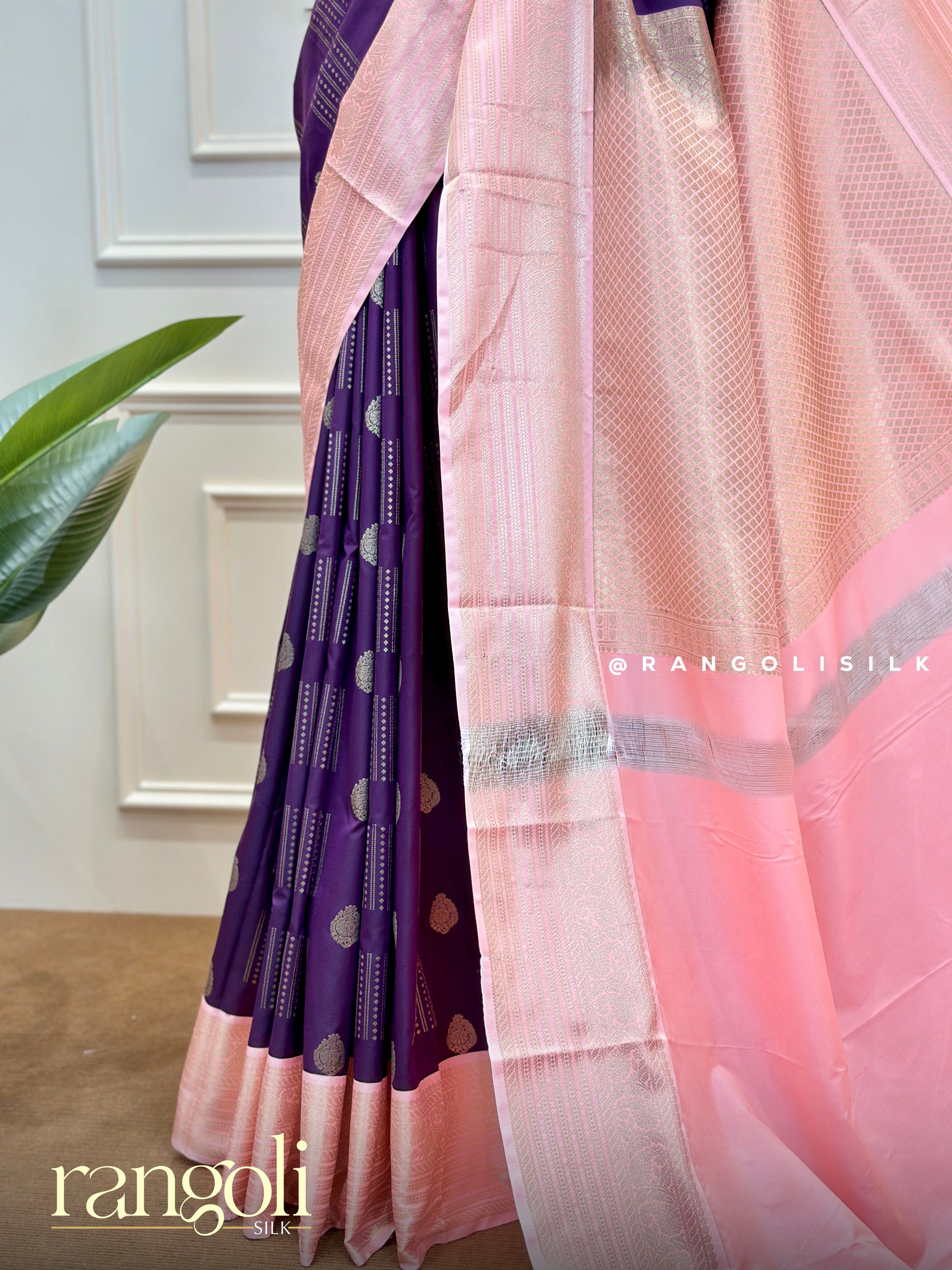 Post 586 - A stunning semi Kanjivaram silk saree in rich shades of royal purple and peach adorned with intricate zari detailing and a contrast border that adds timeless charm. Perfect for festive moments and elegant celebrations . Colours may vary slightly depending on lighting conditions and screen display variations .