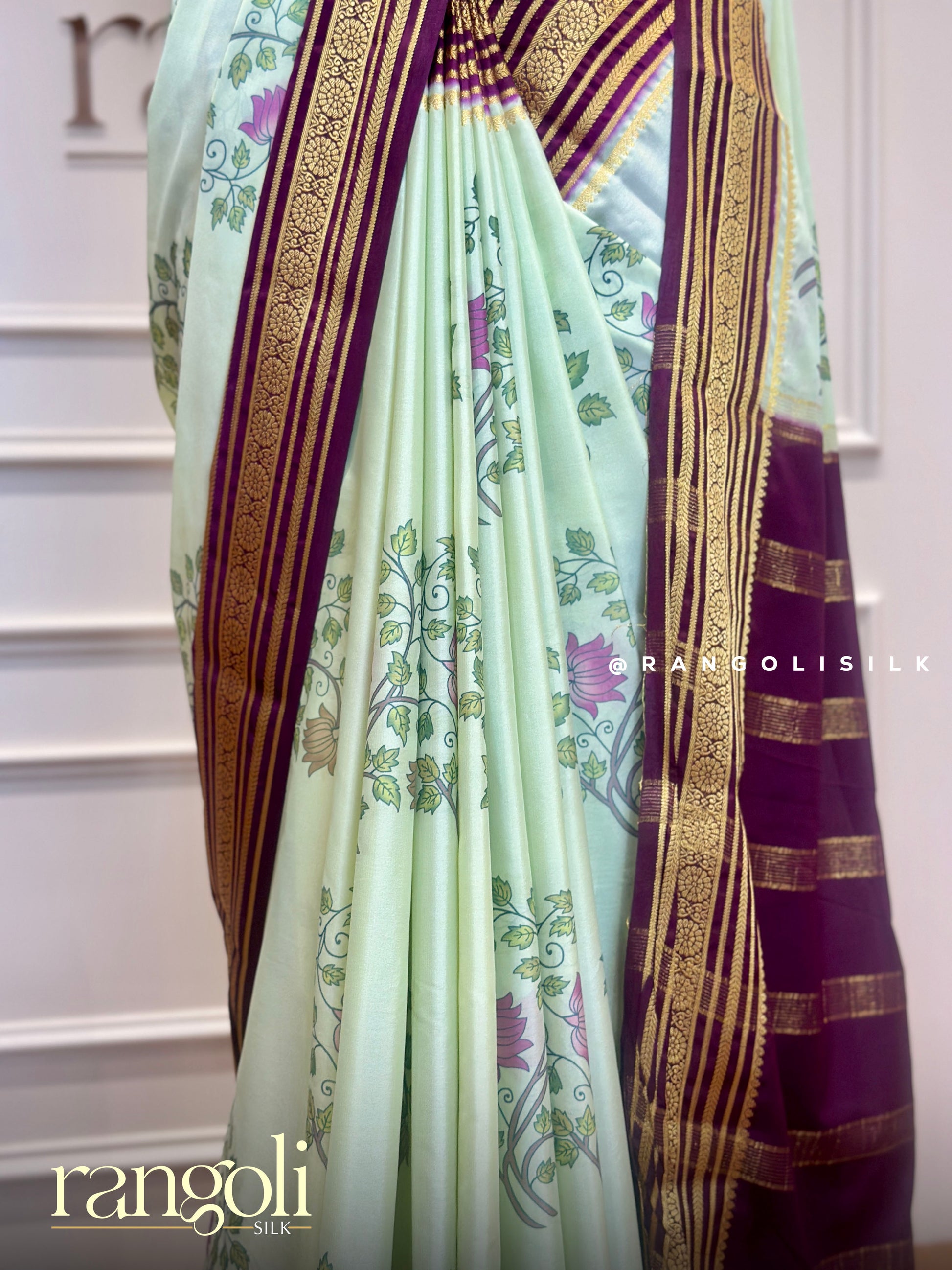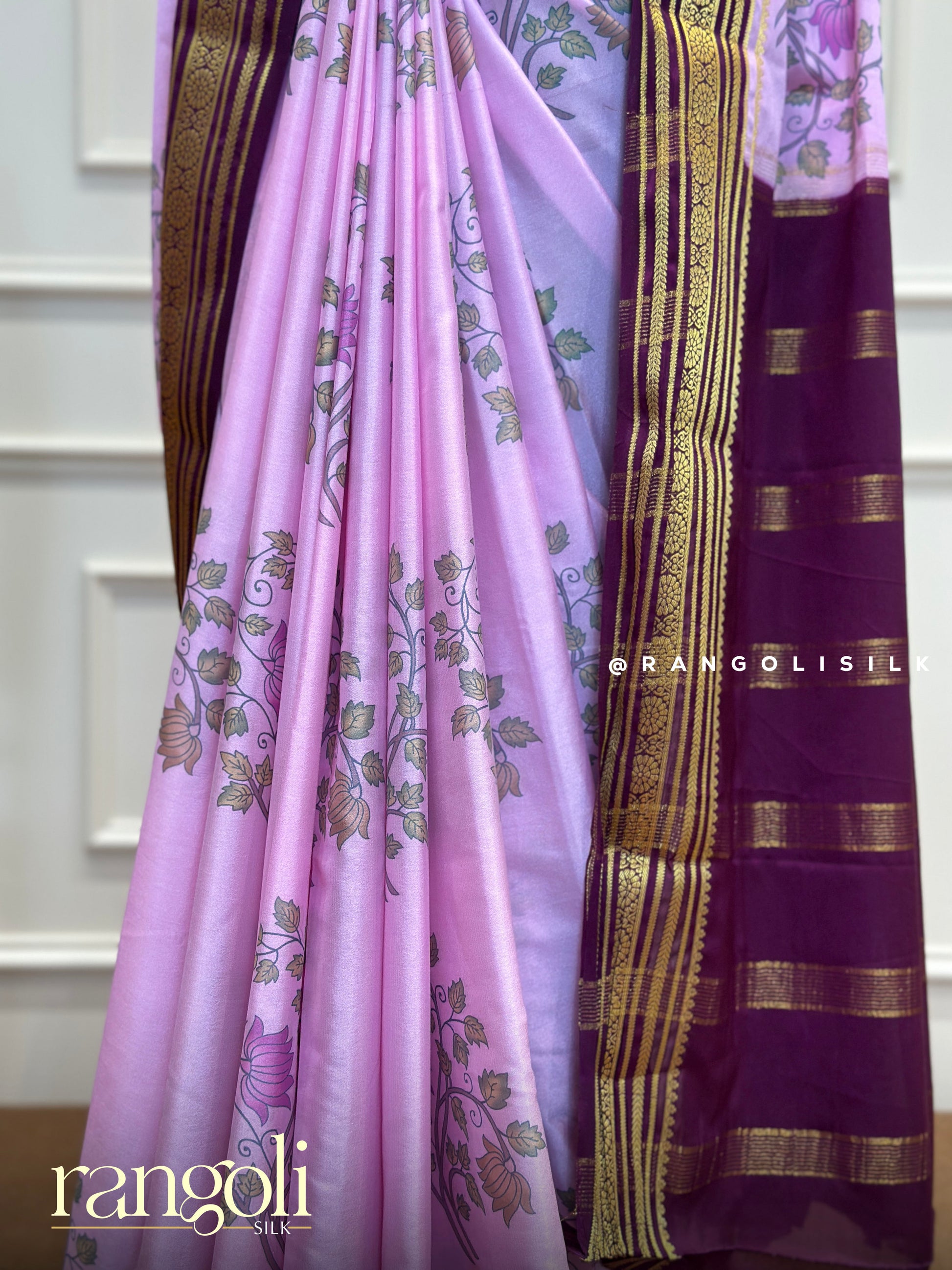 Post 377 - Graceful and lightweight, this semi Mysore silk saree is adorned with beautiful floral prints that add a touch of elegance. Perfect for casual and festive occasions, it blends traditional charm with contemporary appeal.