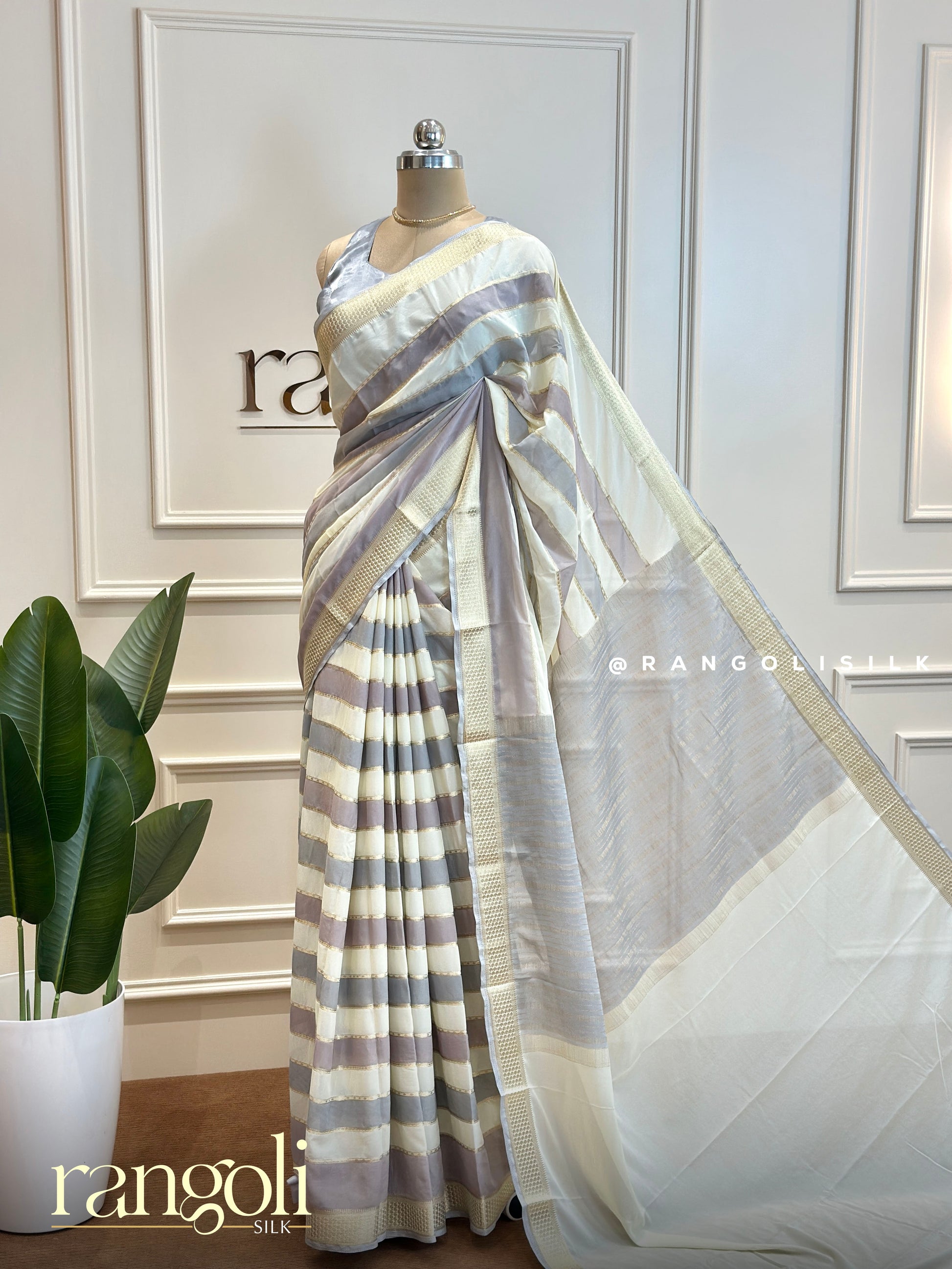 Post 537 - Graceful stripes in hues you’ll fall in love with! Our new semi Mysore silk sarees are here in soft grey, blush pink, and serene sea green – lightweight, elegant and perfect for every celebration.