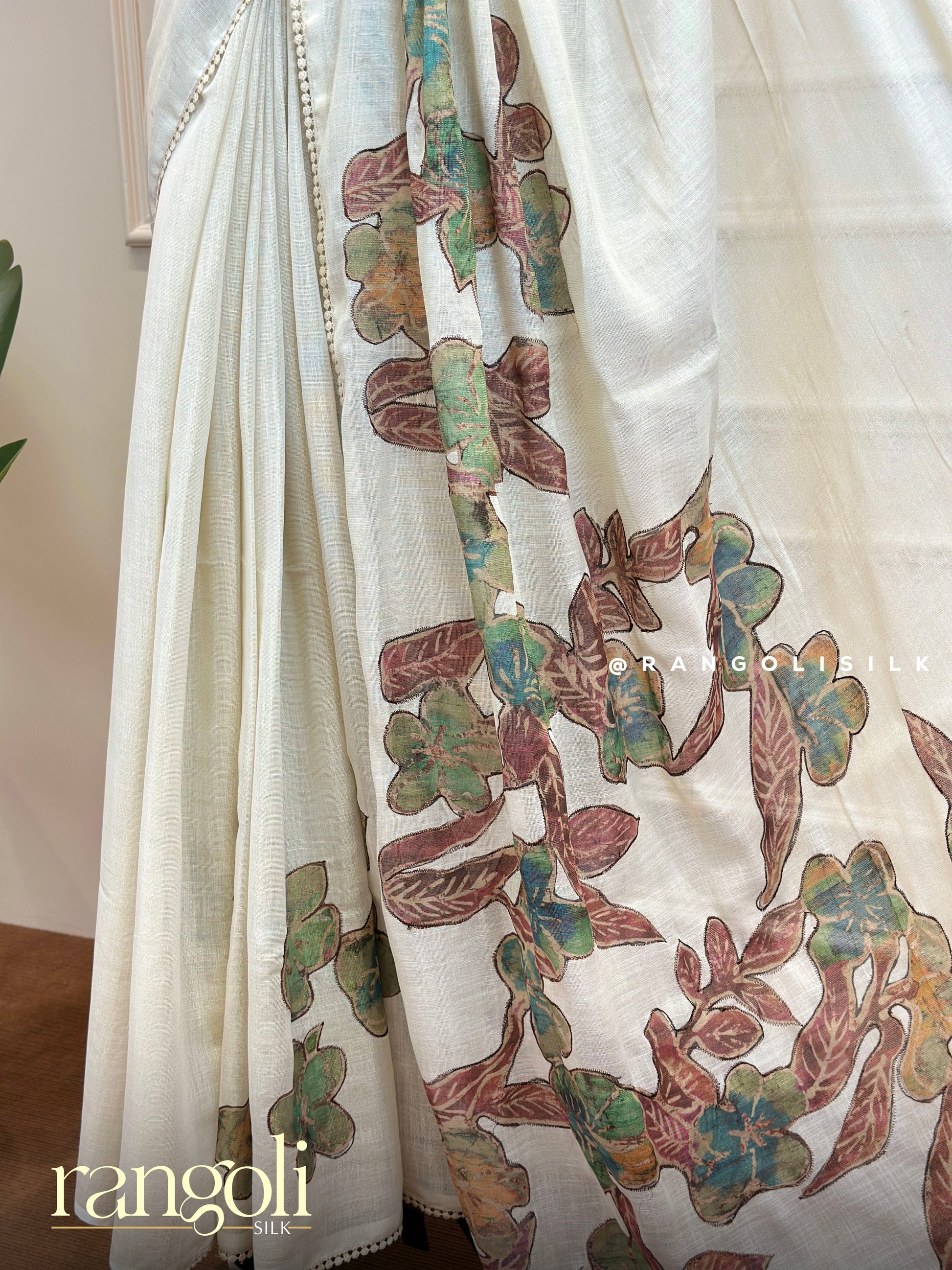 Post 712 - Elegant cotton saree featuring a soft, breathable weave perfect for all-day comfort. Available in rich shades of purple, classic off-white, and earthy olive green. Highlighted with delicate floral prints that add a graceful and timeless charm. Lightweight fabric with a smooth drape, ideal for both casual and semi-formal wear. A perfect blend of traditional aesthetics and contemporary styling.