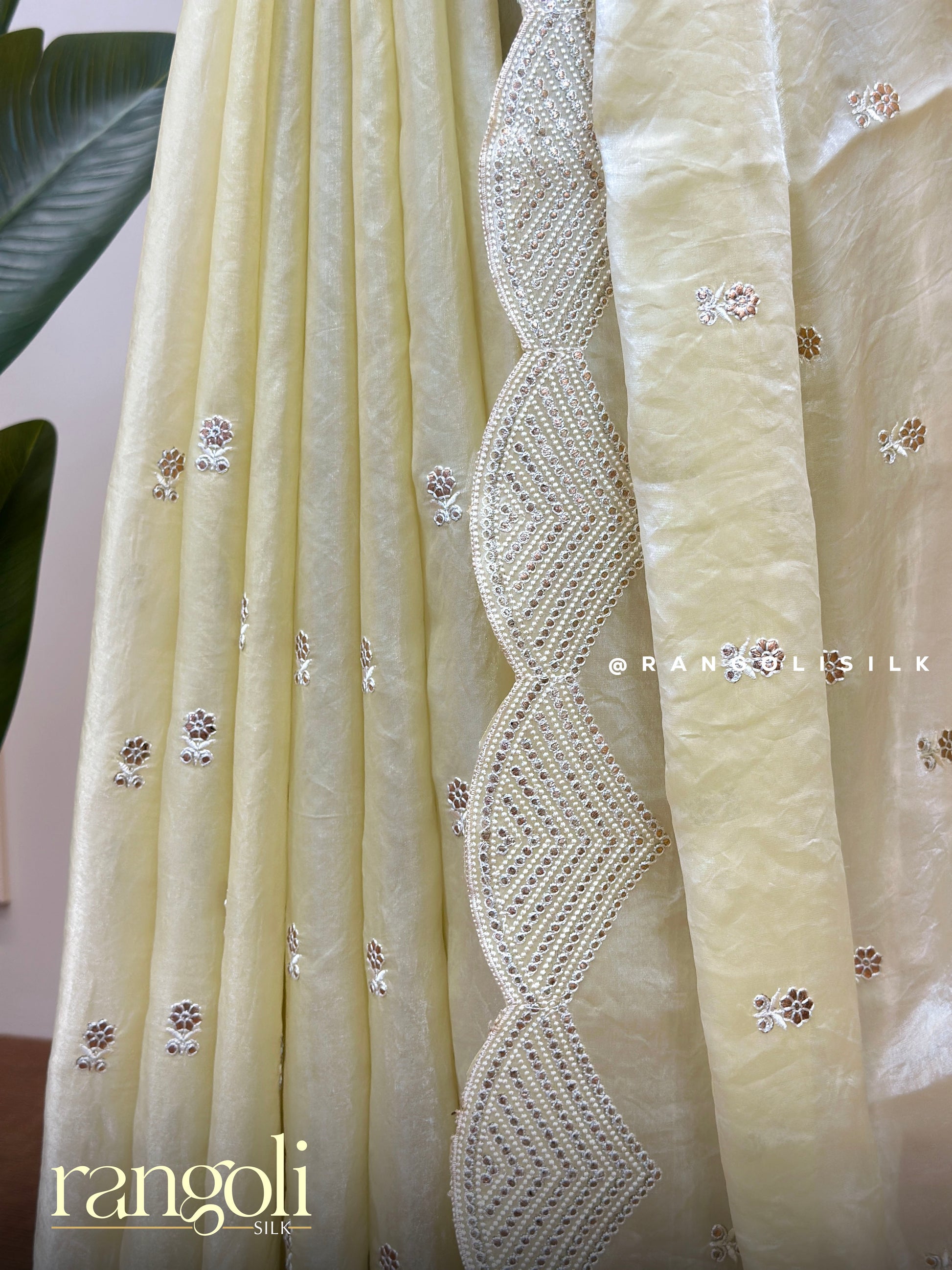 Soft Lemon Shade Designer Saree with Delicate Embroidery & Scalloped Lace - Post 564