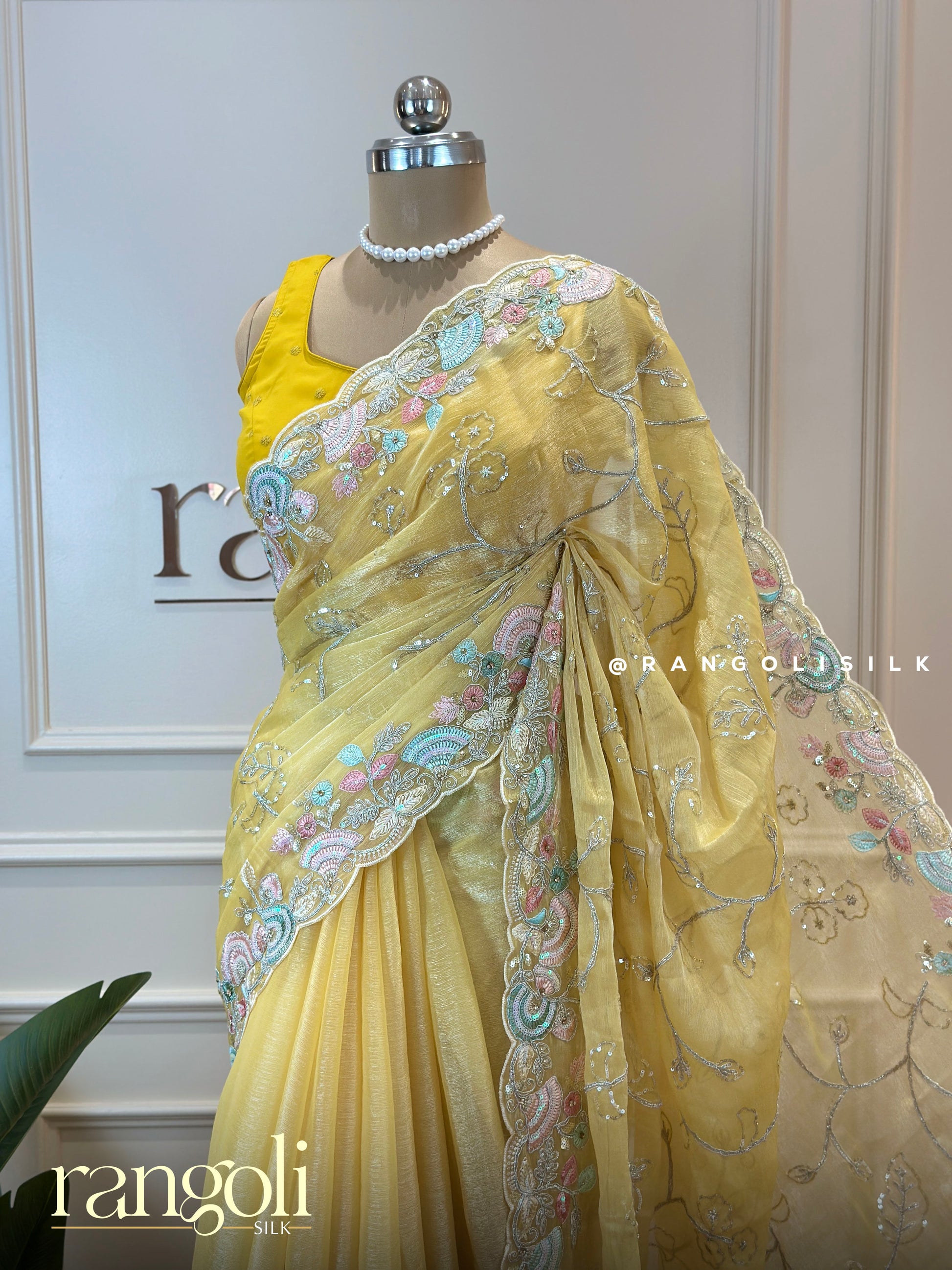 Soft Yellow Designer Saree with Embroidered Pallu & Pastel Floral Borders - Post 626